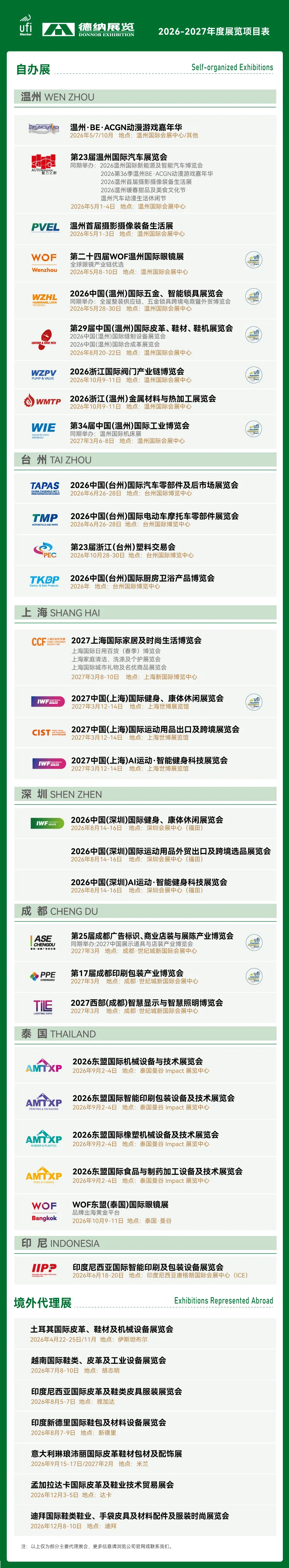 德纳展览1996年创办于浙江温州,是知名的国际国内展会主办机构,业务覆盖展览、会议活动及产业互联网平台。在上海、浙江、四川以及泰国曼谷等地组织举办各类贸易和消费型展览会,年度展览面积超70万平方米,累计服务企业超12万家次,同时代理合作全球30多个国家的国际性展会。