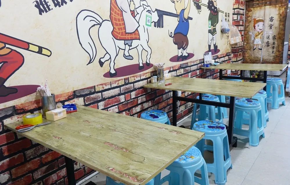 墙面有趣的壁画、原木色的桌椅