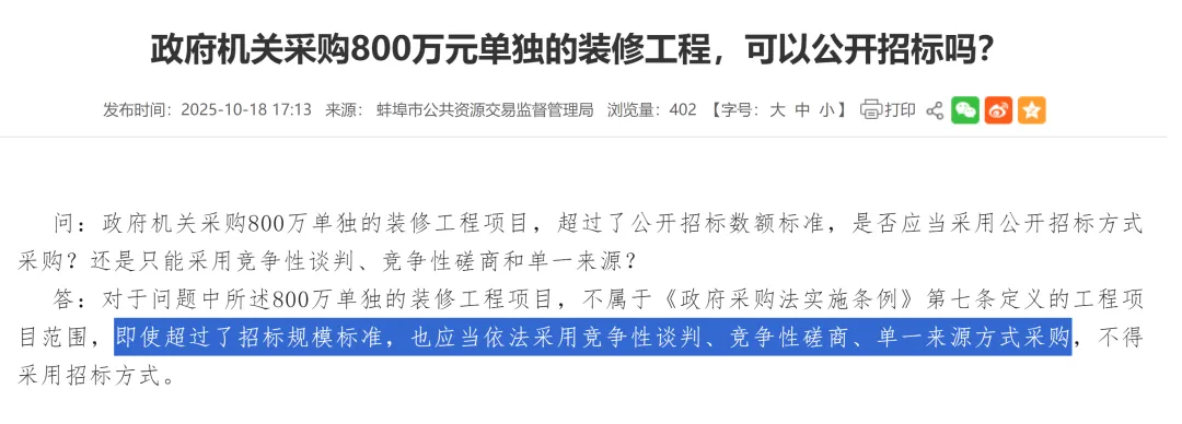 政府采购800万单独装修工程不能公开招标?