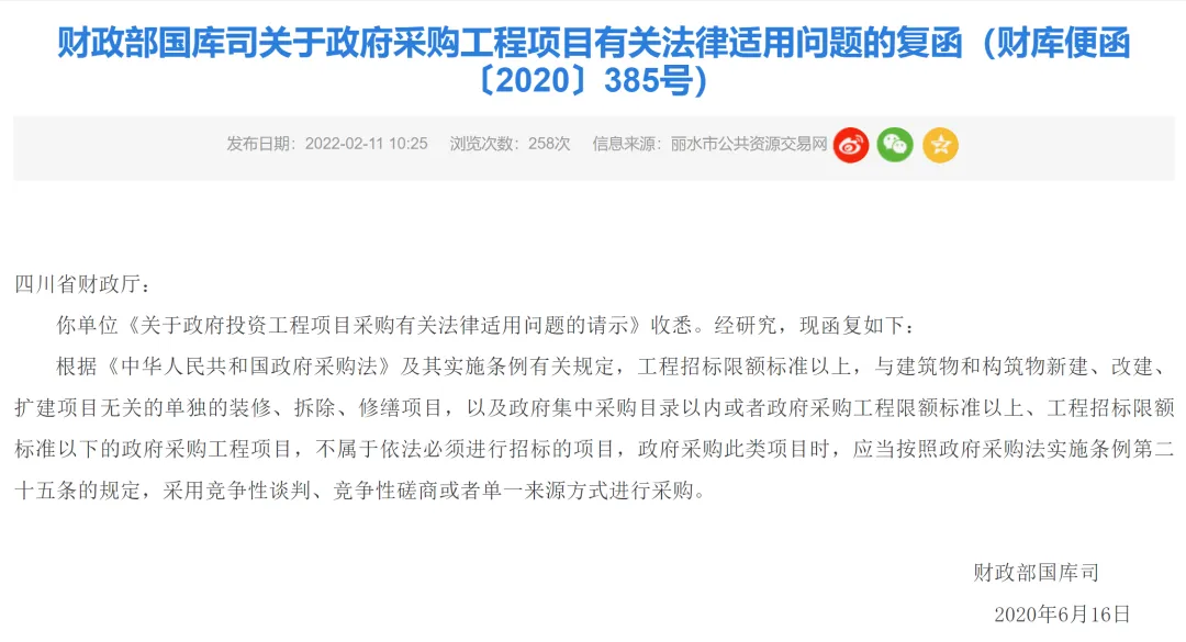 1.财政部国库司关于政府采购工程项目有关法律适用问题的复函(财库便函〔2020〕385号)