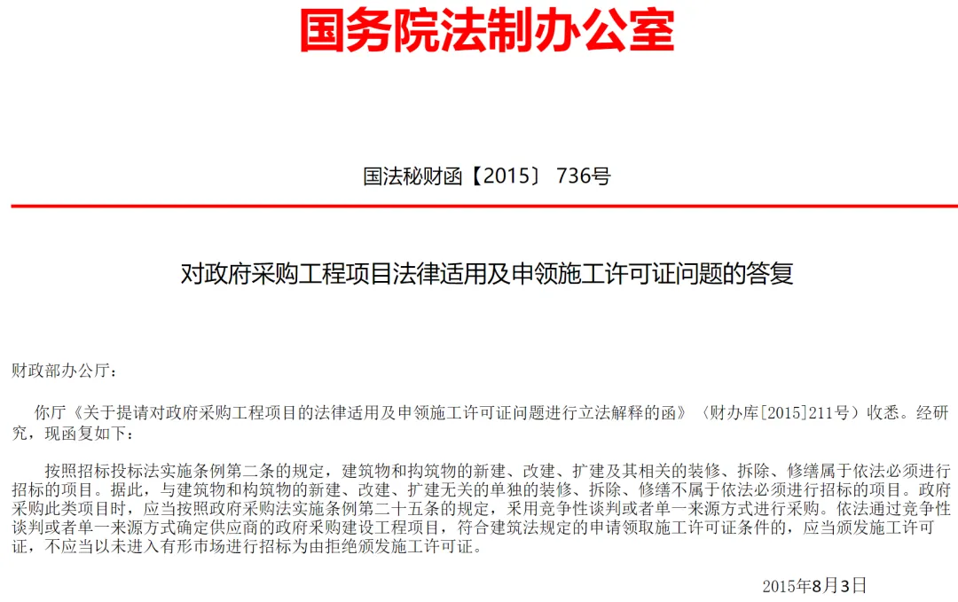 2.国务院法制办公室对政府采购工程项目法律适用及申领施工许可证问题的答复 国法秘财函【2015〕 736号