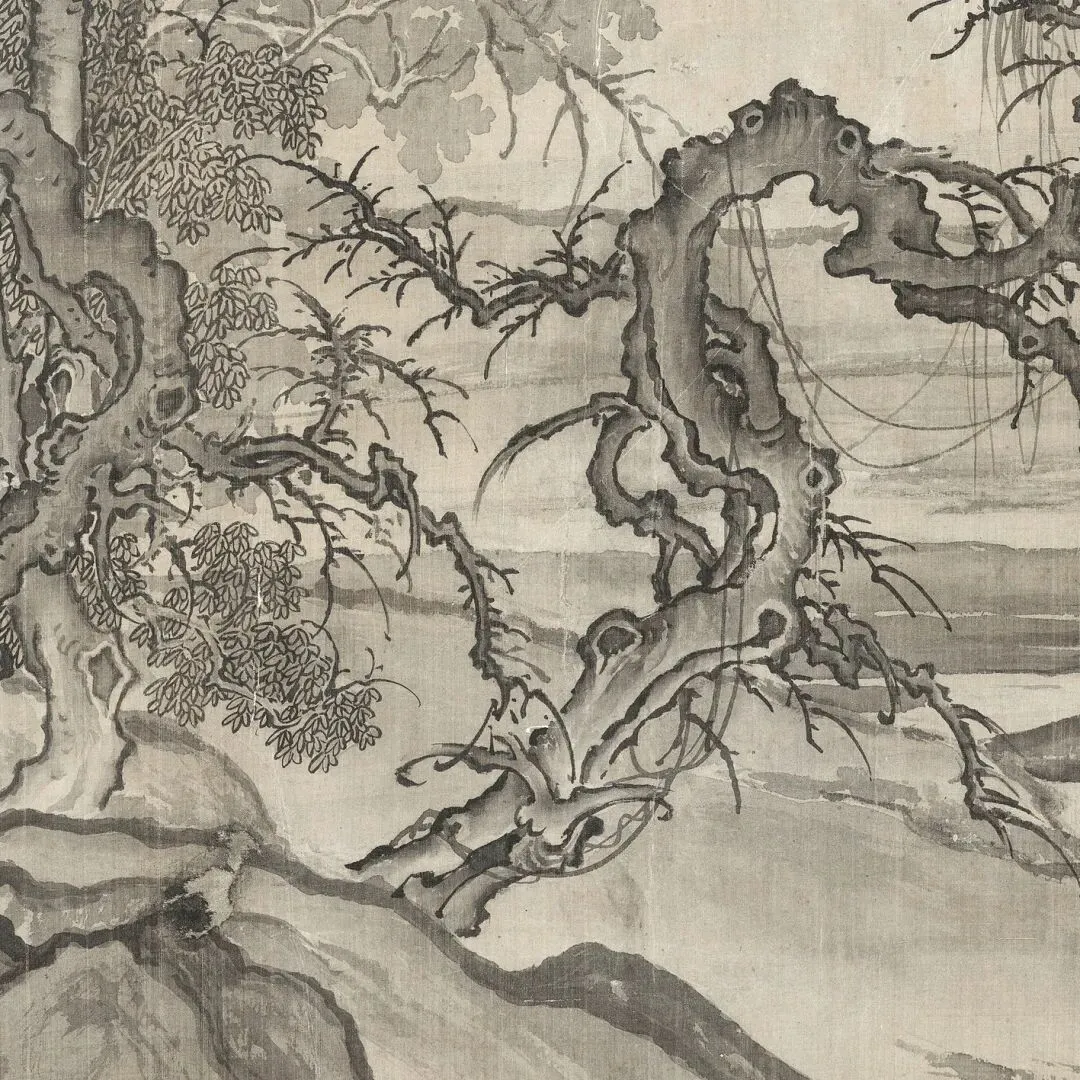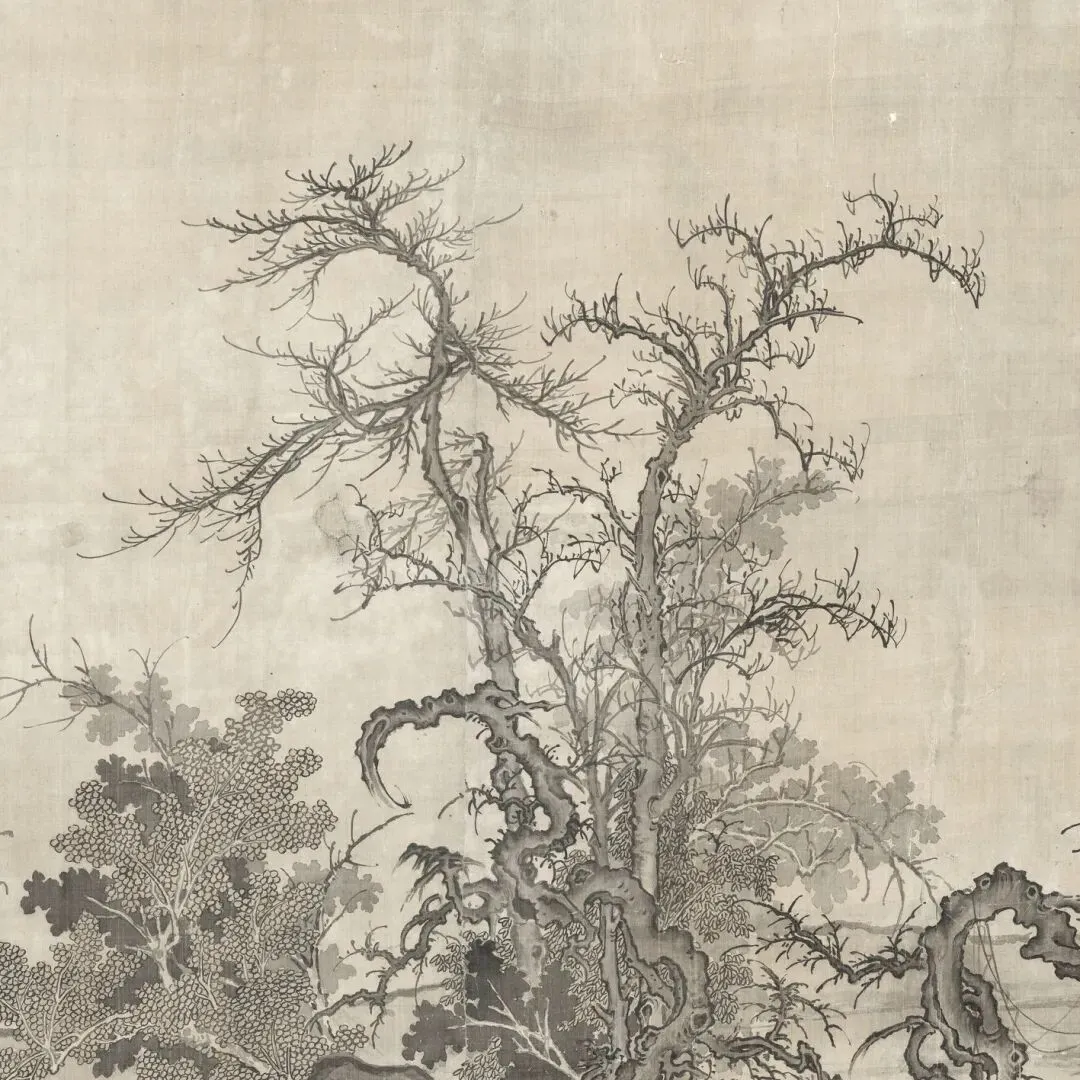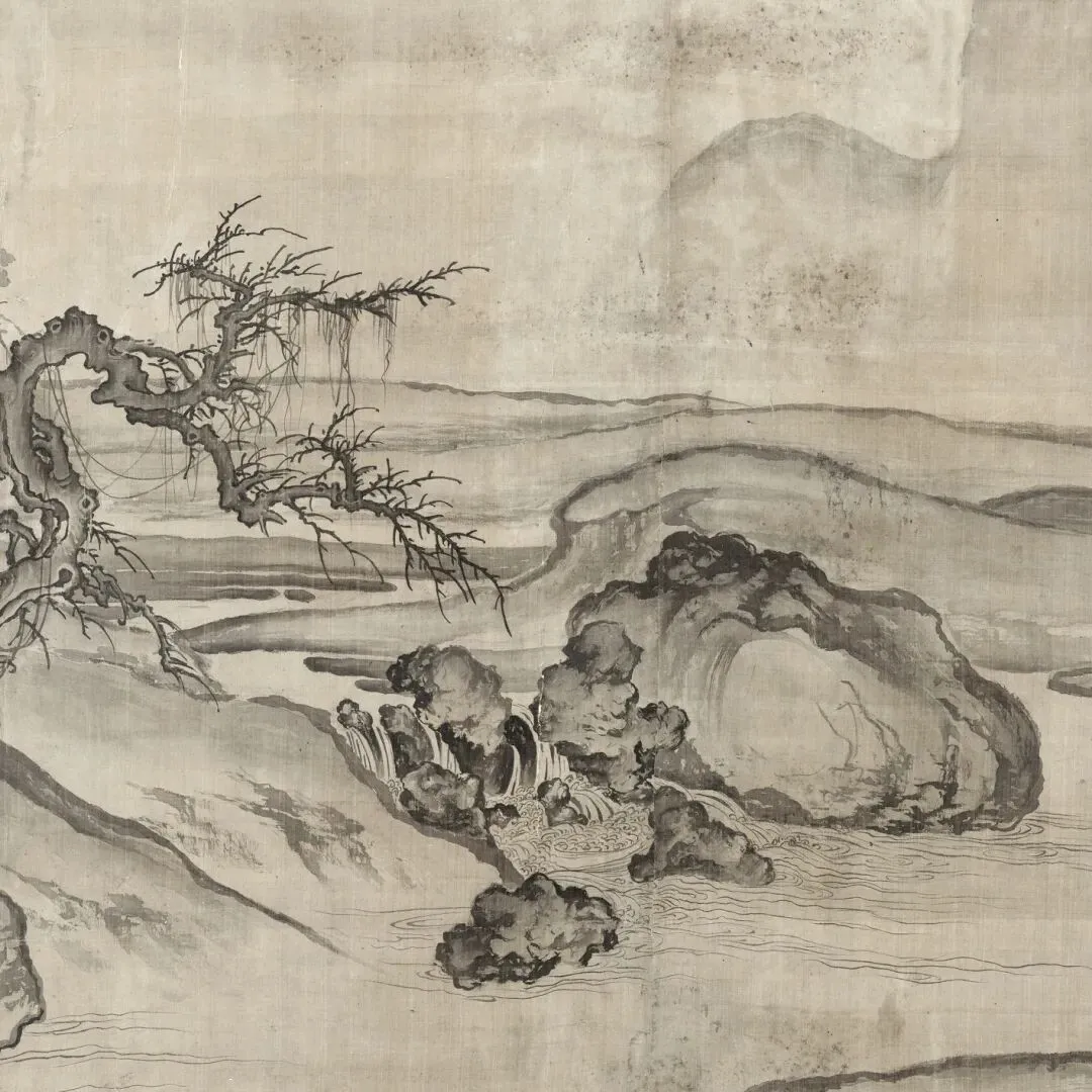 窠石(大块岩石)采用卷云皴,以粗阔扭曲的线条表现北方山石的浑厚盘礴质感,兼具“鬼面石”的雄奇特征。树叶或阔笔清点,或细笔双勾,淡赭烘染呼应秋色。以水墨为基调,略施淡赭,溪水部分用清浅线条勾勒,突出“水落石出”的深秋细节。