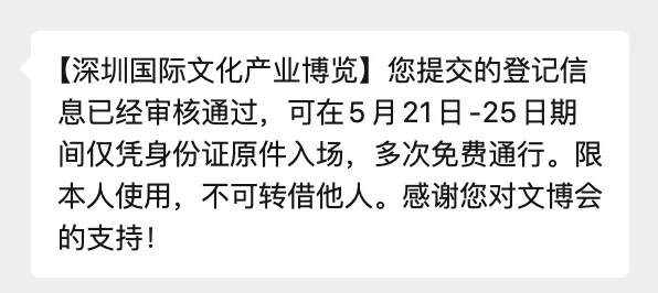 第四步:然后文博会发消息通知你门票申领通过;
