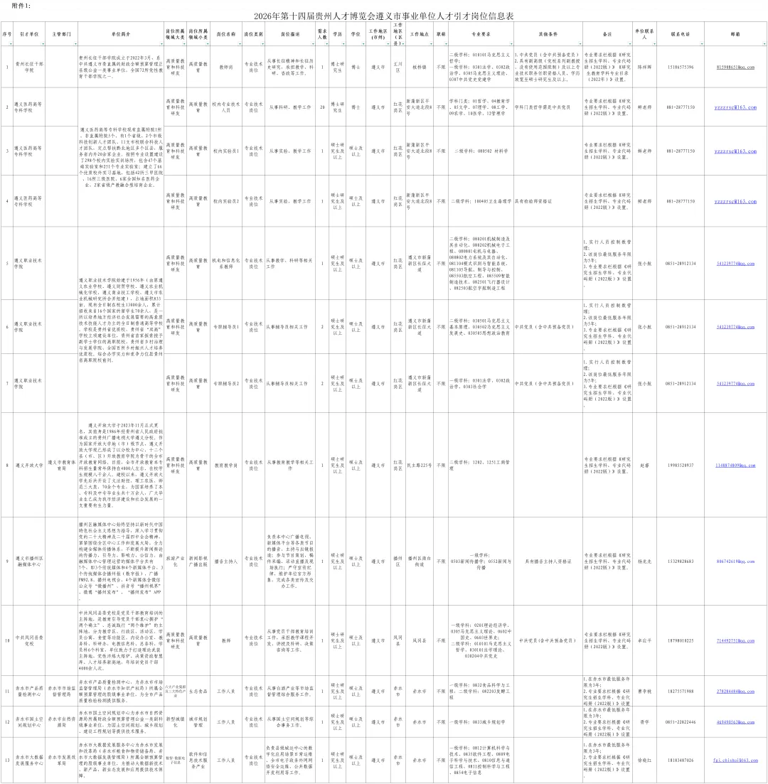 1.2026年第十四届贵州人才博览会遵义市事业 单位人才引进岗位信息表