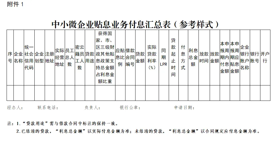 4.申报材料:《中小微企业贴息业务付息汇总表》(详见附件1),表格需加盖银行公章。