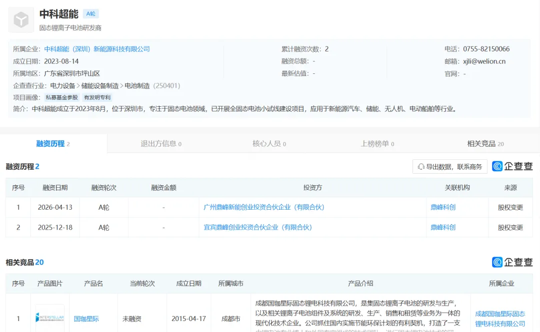 2026年4月13日,据企查查数据显示,专注于固态电池领域的中科超能(深圳)新能源科技有限公司(以下简称“中科超能”)完成A轮融资,投资方包括鼎峰科创。这是继2025年12月首次A轮融资后,该公司在半年内再次获得资本加注,折射出固态电池赛道持续升温的融资热度。