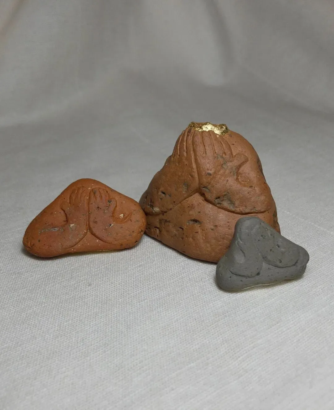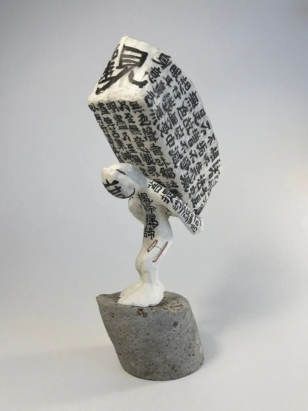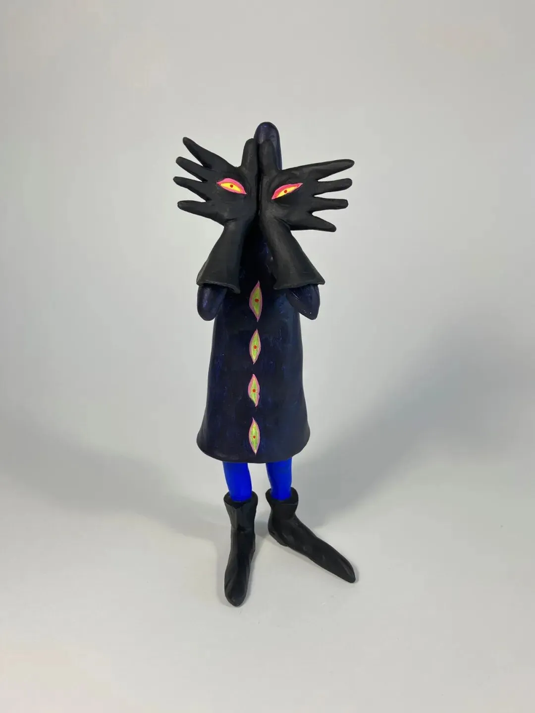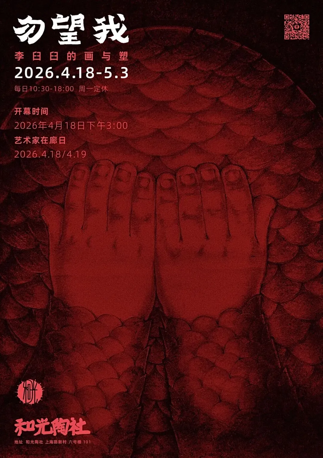 社交媒体的时代,监控的眼无处不在,自曝或被曝,谁都逃不过。你看镜头是死物吧,它其实是眼睛的延申,你的一举一动都被记录在案。古人说苍天有眼,头顶有神明,即便是微渺难信,毕竟神明至善,而如今无处不在的观看者,他们可能是至善的吗?你看这个世界愈多,你被看到的也就愈多。你早暴露了!鸵鸟遇见危险,就把头埋进沙子里,是自欺。而我们何以不自欺,yiyi穿上甲胄,捂上眼睛,这样就足以自保?不知道,当你捂上眼睛,世界最后的残影慢慢消失的时候,内心的欲念依然汹涌不止。这就有了臼臼的“无用的立体”,他用各种材料来做小雕塑,用超轻粘土、废砖、蜡,再涂以色彩和纹饰。《背筏子的人》遍身经文,欲自渡河,彼岸有什么?救赎是可以靠文化和自身达成的吗?可以靠阿罗汉们接力完成吗?我看到臼臼一直在发问,在发问中,自身慢慢融化,时间里留下了精油的香气,那是yiyi的香魂。江边砖 金属箔 丙烯 高 25mm- 62mm不等 综合材料(纸黏土丙烯) 170mm*55mm*60mm 2025综合材料 单个高82mm 组合高156mm 2025综合材料(纸黏土、铜、回收餐具、木、混凝土、中国墨、丙烯) 195mm*80mm*120mm 2026时间来到星期六,每一周都有星期六,但不是每一个人都能得到休息,比不能休息更恐怖的事情,就是人和人的互残。这就来到了第四个主题《这里是星期六》,里面的面孔不再被掩盖,容颜可以模糊,眼神格外分明,他们是不捂眼的yiyi:可怜、凶残,暴虐,绝望……去和他们对视吧,或许能看到自己。李臼臼,男,学画四十载之神登,曾以作图为业,南京人。好车马、声香,有工作室“红龟”,隐于二板桥。和光陶社 南京市上海路新村六号楼101