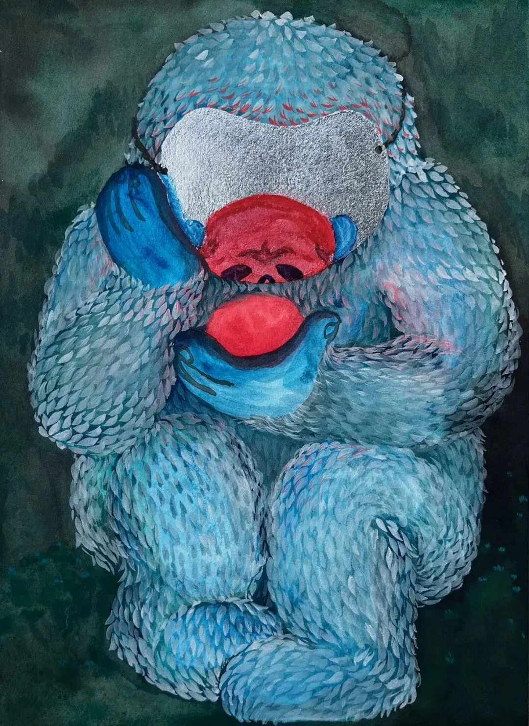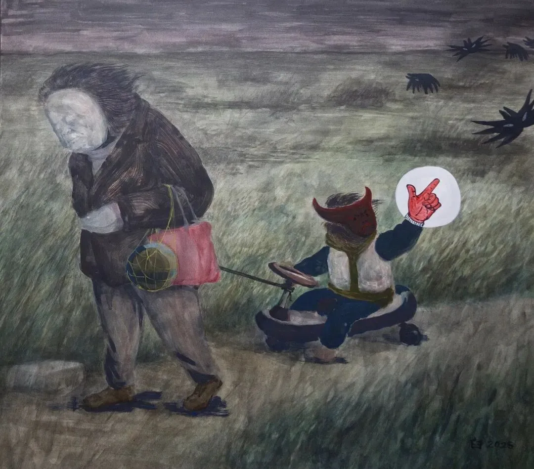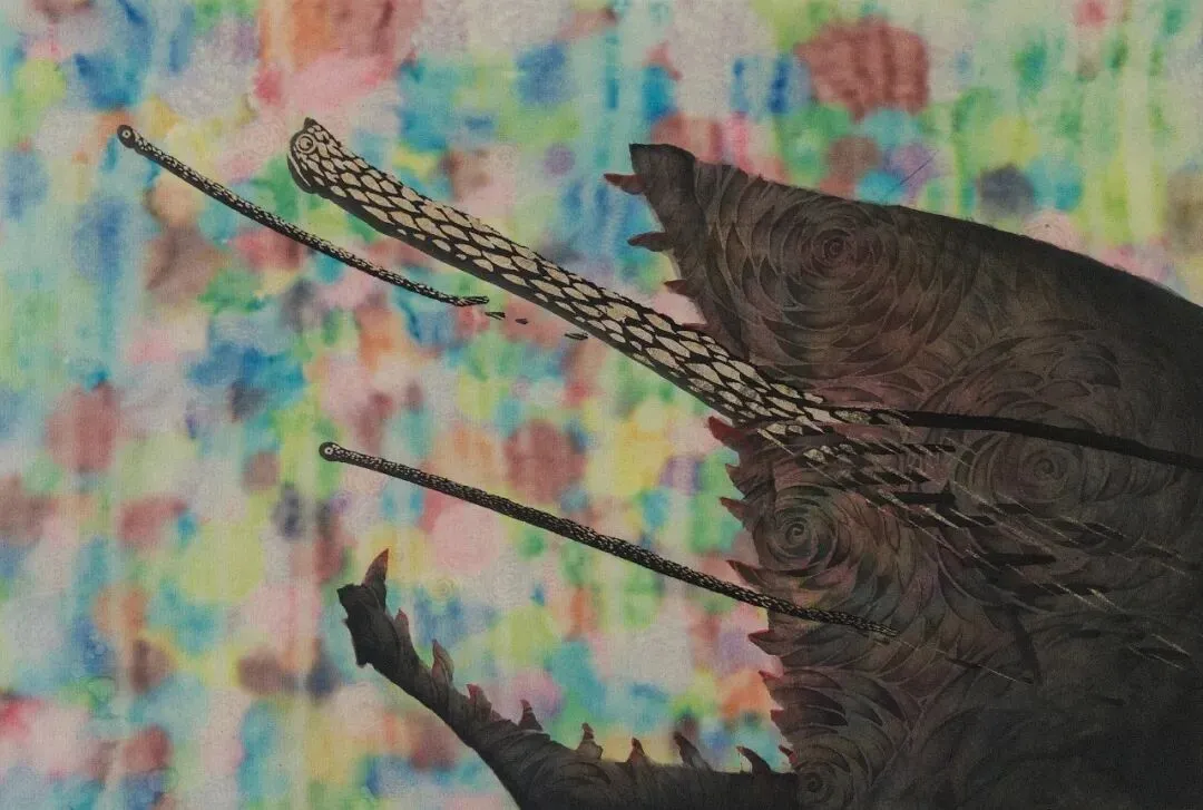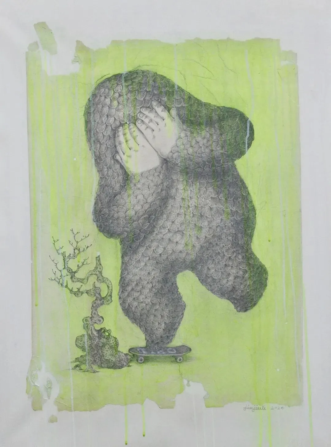 李臼臼会让我想起李北北,成都人是这样叫李伯清的。可是李臼臼不是李北北,李北北只消动嘴,李臼臼要忙的多,他玩图像、塑形,还有轻度迷幻的音乐。总的来说,臼臼是手艺人,看完本次展览,你会承认:他手艺扎实,称得上是一位严肃的视觉工作者。在南京,李臼臼藏于“红龟”——这是他的工作室,既可以远眺紫金山和狮子山的烟云,也能俯瞰热河南路的烟火和爱情,和李北北一样,他不缺市井气。Tiro 铅笔 丙烯 胶水 纸480mm*650mm 2026本次海报取自他一张作品,画中的“yiyi”只露出了一双手,满身覆盖着鳞片,又像是满披铠甲。yiyi系列画作的原型是一个小姑娘,拥有不同的分身,有时候像是犰狳和树懒的合体,有时候像只毛猴子,甚至是毛毛虫,不是捂住了眼,就是戴了面具,yiyi是幼态的、潺湲的、自得的、害羞的,捂住了眼,就捂住了“心灵的窗户”,叫人无法窥探,看不进、觑不见、望不穿、睇唔着。端详 纸面水彩 金属箔 195mm*270mm 2023大桃子 纸面水彩、蛋彩 595mm*520mm 2026你妈是石头 纸面水彩、蛋彩、荧光色浆 180mm*125mm 2025yiyi系列是我自己格外喜欢的。捂上眼睛,就是它主动建立了界限,不被解释,保留自己的内心,还能在你不提防的时候,迅速移开双手看你一眼。有些画面略有诡异气氛,但这恰恰是臼臼的温柔隐身术,他试图把他经验的世界给你看看。