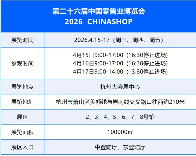 2026中国零售业博览会(CHINASHOP杭州零售展)定于4月15–17日在杭州大会展中心举办。