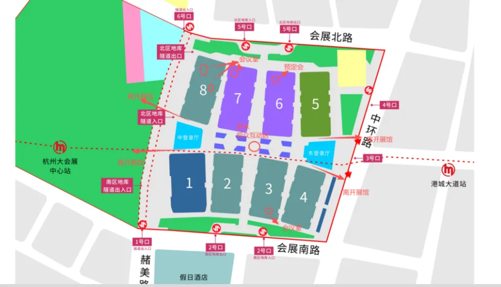 定位至“杭州大会展中心”,展会当天周边可能实施交通管制,需提前下车步行至展馆。3. 自驾导航至“杭州大会展中心地下停车场”,收费标准:5元/小时,每天30元封顶;按停车场指示前往对应登录厅上楼(1、2、7、8号馆近中登录厅,3、4、5、6号馆近东登录厅)。