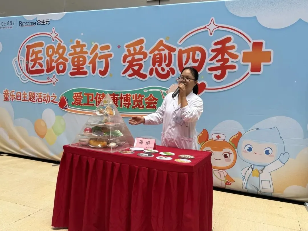 “米饭住在最底下的大房子里,蔬菜水果住在二楼,最顶上的小阁楼住着糖果和油炸食品——谁住得最多呀?”消化营养科周娟医生用一座色彩鲜艳的饮食金字塔模具,把专业术语变成孩子们听得懂的童话,让孩子们在笑声中记住了均衡饮食的要点。