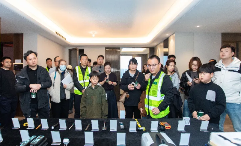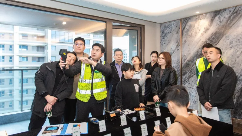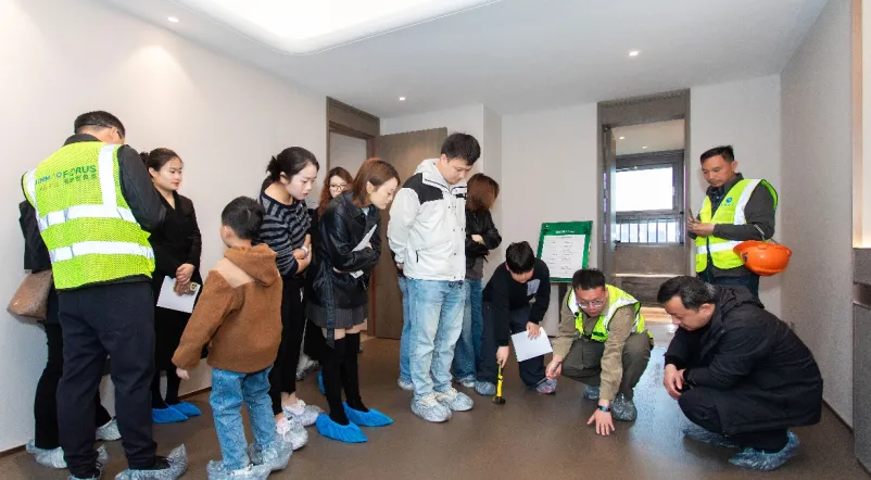 4月12日,狮山金茂府开展了苏州首个“质量开源管理活动”。50余位业主家人受邀走进项目室内,在专业工程师的全程引导下,对照数十项验收标准,逐项检阅家的每一处细节。活动现场,从风速仪、靠尺、角尺到空鼓锤、相位检测仪等专业质检工具一一陈列,业主们在工程师的讲解中,深度参与丈量墙面平整度、检测水电点位精度、查验门窗密闭性能等质检活动中。