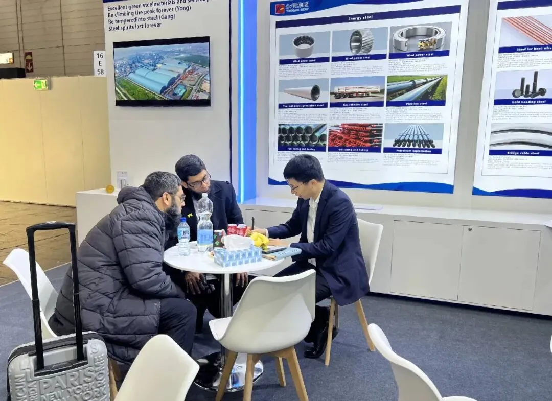 永钢始终坚持自主创新与绿色制造,多项产品采用全球领先的在线等温热处理、余热熔盐储能等低碳工艺。展会期间,团队全程一对一精准对接,与来自欧洲、美洲等地的客户深入交流,耐心解答产品参数、应用场景及合作模式等疑问,清晰展示产品优势与核心竞争力。不少客户深入了解后当场表达合作意向。