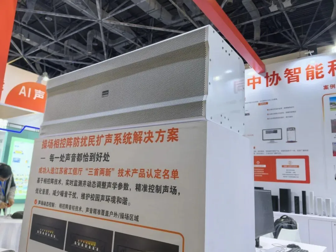 采用相控阵发声技术,精准控制声束方向,将声音能量集中在操场区域,有效降低对教学楼及周边居民区的干扰。支持远程管控、实时声场分析,已在北京、南京、杭州等多地中小学成功应用。现场互动区,观众可以直观感受定向传声的效果。