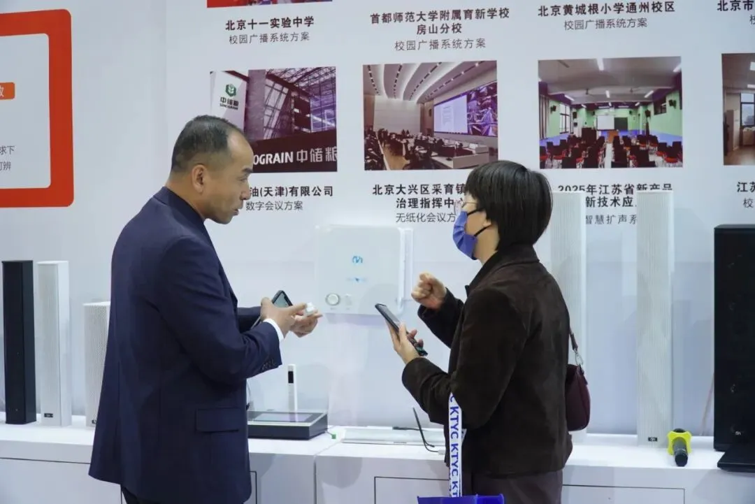 北京潞河小学的客户到访展位,从扩声系统聊到广播系列。客户对定向广播功能非常感兴趣。技术工程师进行了系统性介绍,包括设备重量、安装方式、与原系统的无缝对接等细节。
