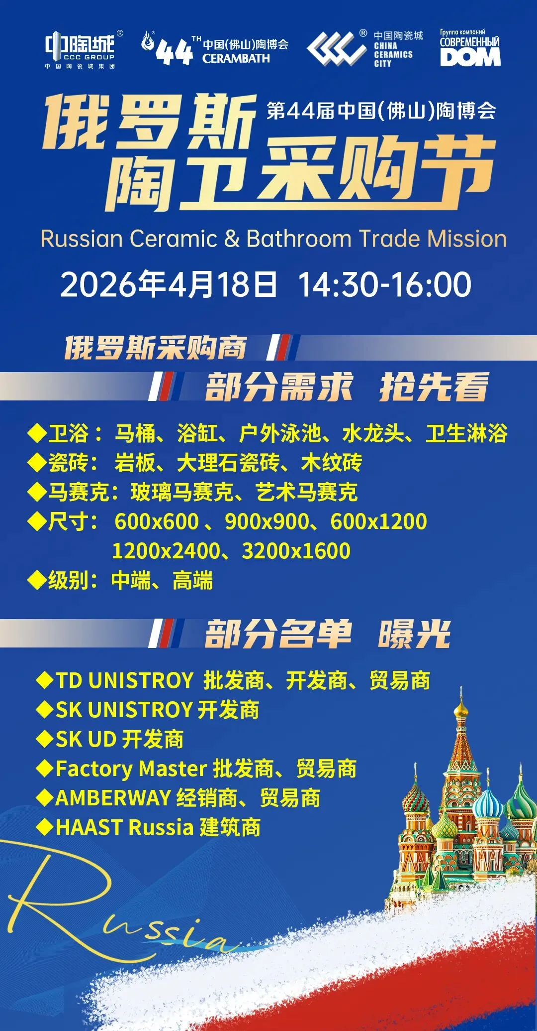 活动预告 | 第44届中国(佛山)陶博会-俄罗斯陶卫采购节需求发布!