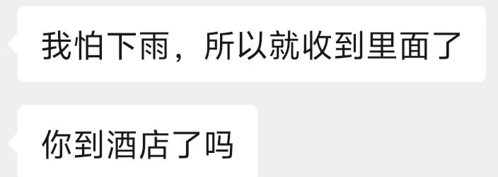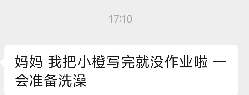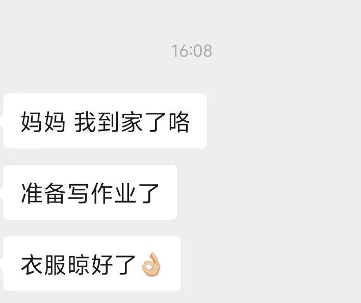 早上走得急,洗衣机里的衣服没晾,出门前跟宝宝说放学帮忙晾一下。她一到家就发信息告诉我:衣服晾好了,怕下雨又收进来了,准备写作业。