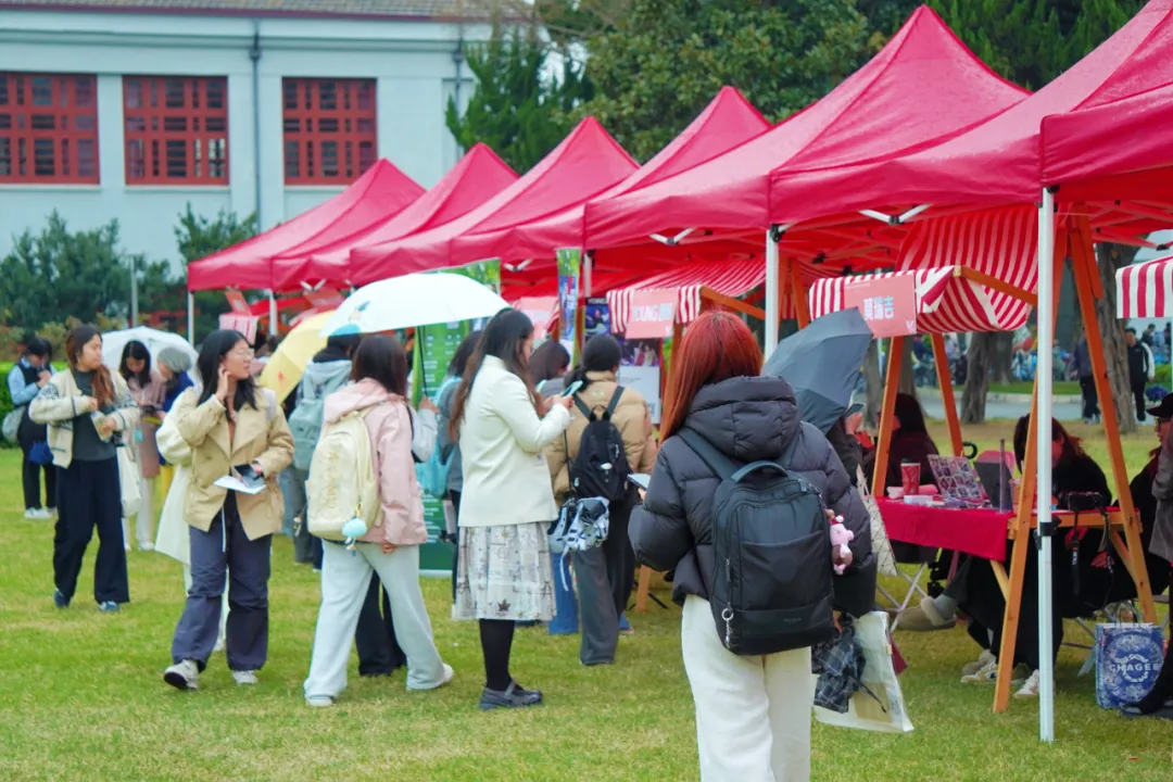 活动伊始,相辉堂前草坪便人头攒动,热闹非凡。各大演艺机构的摊位依次排开,精心布置的展示区和琳琅满目的剧目介绍,迅速吸引了大批师生驻足。同学们怀揣着对艺术的热爱,在各个摊位前有序排队,咨询剧目信息、选购福利门票。各演艺机构的工作人员都热情满满,耐心地为师生讲解剧目亮点、购票流程,还为购票师生准备了周边、文创礼品等暖心小礼物。活动进行中,一场春雨悄然降临,却丝毫没有削减师生们的参与热情。
