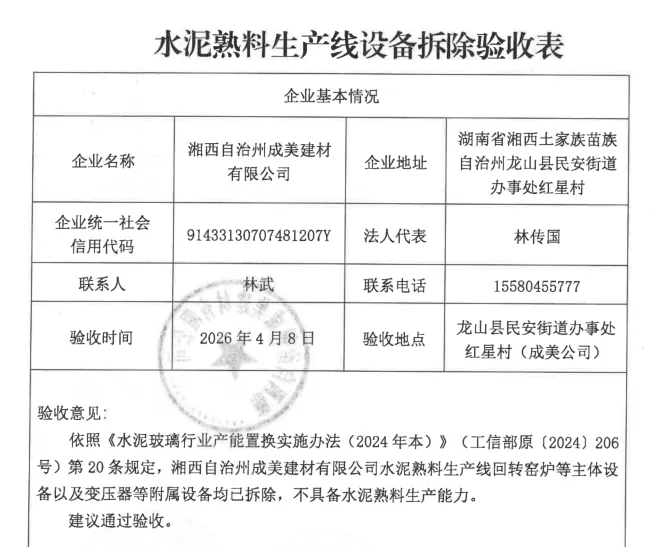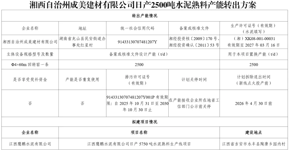 据了解,湘西自治州成美建材有限公司出让2500t/d产能至江西鹰鹏水泥有限公司,用于补充4500t/d至5750t/d,置换比例2∶1。