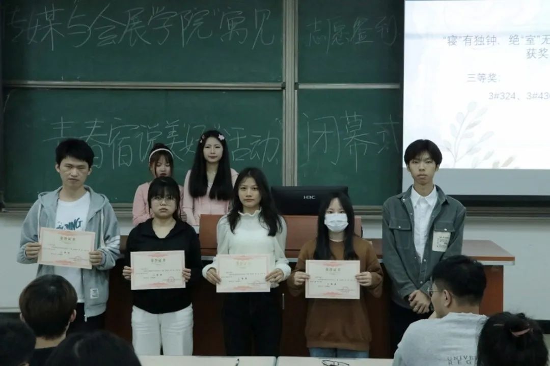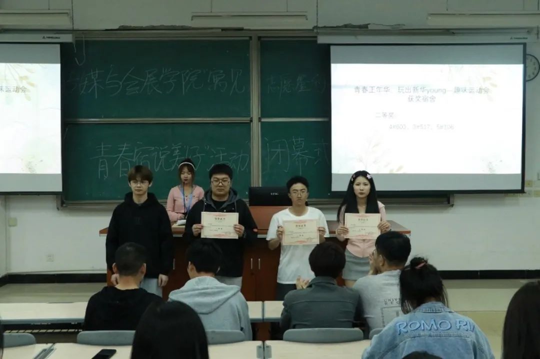 闭幕式上,首先由主持人开场,本届社区建设嘉年华积极贯彻落实学校关于开展“一站式”学生社区建设工作的文件精神,自3月28日开幕以来,历时一个多月,在学校领导老师的关心支持下和同学们的热情参与下,成功举办了“青春正年华,玩出新花young”趣味运动会、“‘寝’有独钟,绝‘室’无双”舍标设计大赛、“寝室‘映’像”宿舍风采大赛三大板块的活动,为同学们留下了宝贵的青春校园回忆。随后,由传媒与会展学院自律会各学生干部依次为获奖宿舍颁奖并合影留念。