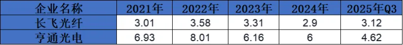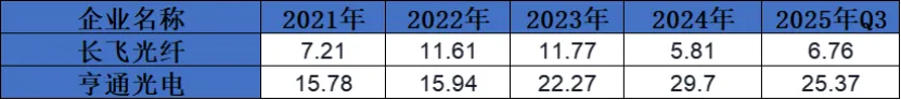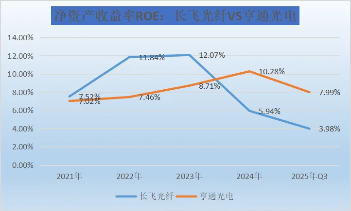 长飞光纤和亨通光电在各年份的ROE数值较为接近,但整体上长飞光纤在多数年份(2022 - 2023年)略高于亨通光电,说明在这期间长飞光纤运用自有资本获取收益的能力相对稍强,能为股东创造相对更高的回报。不过在2024年亨通光电的ROE超过了长飞光纤。