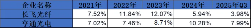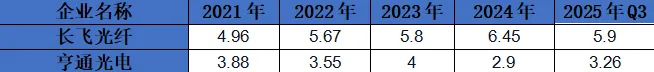 长飞光纤:2021 - 2024年呈现上升趋势,从4.96增长到6.45,说明这几年公司持续加大研发投入占比,可能致力于开发新技术、新产品,拓展市场份额或提升产品竞争力。然而,2025年第三季度数据降至5.9,虽然仍高于此前多数年份,但这一回落或许暗示公司在研发投入策略上有所调整,可能是阶段性研发目标达成后的策略性收缩,或是受到市场环境、公司财务状况等因素影响。