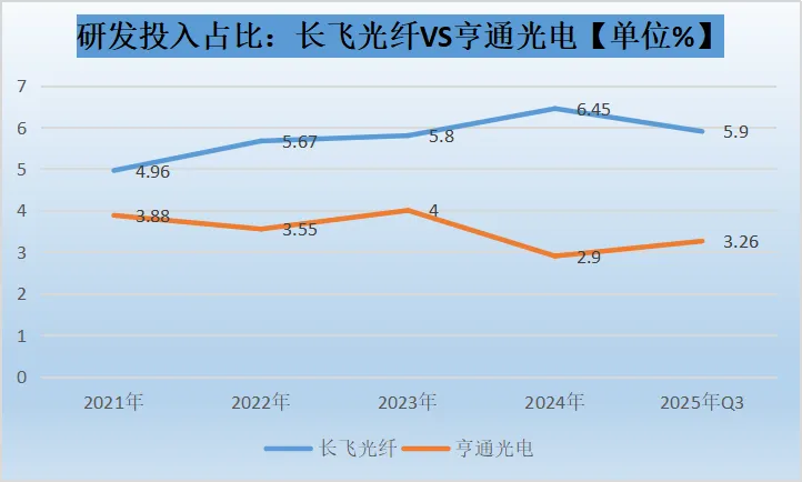 亨通光电:数据波动较为明显。2021 - 2022年从3.88下降到3.55,可能是公司在该阶段更注重成本控制或对研发项目的筛选更为严格;2022 - 2023年回升至4,显示公司重新重视研发投入;但2024年又大幅降至2.9,2025年第三季度略有回升至3.26。这种波动可能反映出公司在研发战略上不够稳定,或是受到行业竞争、技术变革等外部因素干扰,不断调整研发投入方向和力度。