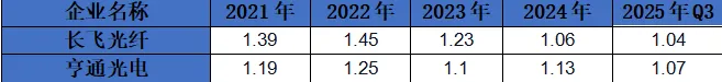 长飞光纤2021- 2022年,速动比率从1.39上升至1.45,说明这一年间企业的短期偿债能力有所增强,可能是由于速动资产的增加或流动负债的减少导致,企业在这期间可能优化了资产结构或更好地管理了债务。2022 - 2024年呈现下降趋势,到2024年降至1.06,接近但仍略高于1。这可能意味着公司的短期偿债压力在逐渐增加,需要关注速动资产的变现能力和流动负债的规模变化,以防止出现短期偿债困难的情况。2025年第三季度进一步降至1.04,延续了之前的下降趋势,企业应重视短期债务的偿还安排,确保财务稳定。