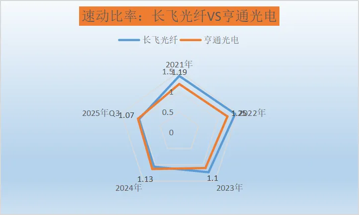 两家公司的速动比率数值较为接近,且在各年份中均围绕1上下波动。这表明从整体上看,长飞光纤和亨通光电在短期偿债能力方面表现相近,都基本具备用速动资产偿还流动负债的能力,但也没有非常充裕的缓冲空间。