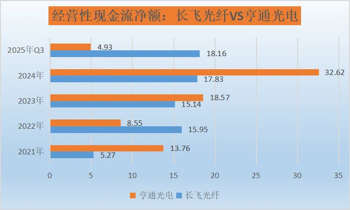 稳定性:从数据上看,长飞光纤的经营性现金流净额表现出较强的稳定性。从2021年至2025年Q3,虽然数值有所波动,但整体趋势是稳步增长的。