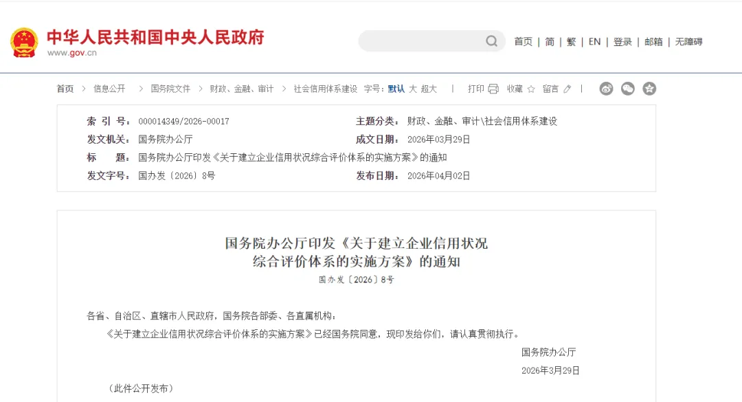为建立企业信用状况综合评价体系,提高评价水平,推动企业诚信守法经营,营造良好市场环境,4月3日,国务院办公厅发布《关于建立企业信用状况综合评价体系的实施方案》(国办发〔2026〕8号)(“以下简称《实施方案》”)。该方案对公共信用评价和市场化信用评价进行了系统化梳理,其中行业协会商会作为信用评价体系的参与方之一,获得明确的制度定位,值得行业协会商会关注。