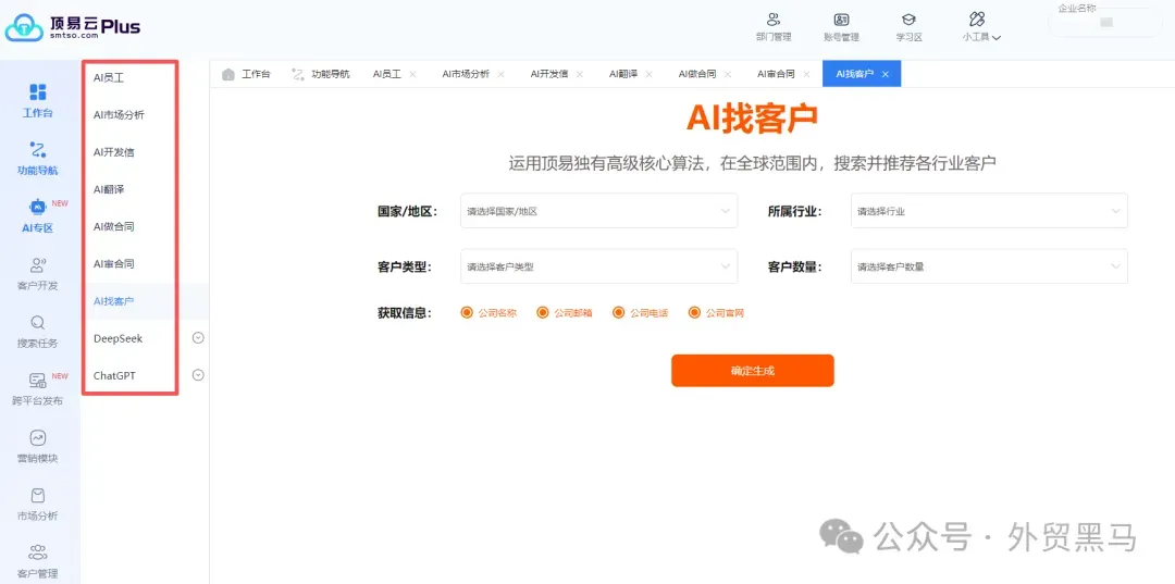 顶易云软件AI全自动获客:自动分析产品关键字、搜索客户资料、自动群发邮件,无需操作坐等询盘。全面实现AI办公:AI写开发信、AI翻译、审合同,AI创作文案,八大场景智能生成视频文案并且结合了全球搜索引擎搜索客户信息+谷歌地图搜索客户+社交搜索+海关数据查询+AI决策人挖掘邮箱+广交会数据+采购商询盘+WhatsApp搜索群发+领英营销+邮件群发+CRM客户管理