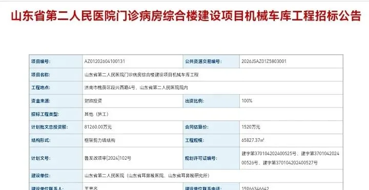 近日,济南市公共资源交易中心发布了山东省第二人民医院门诊病房综合楼建设项目机械车库工程招标公告。