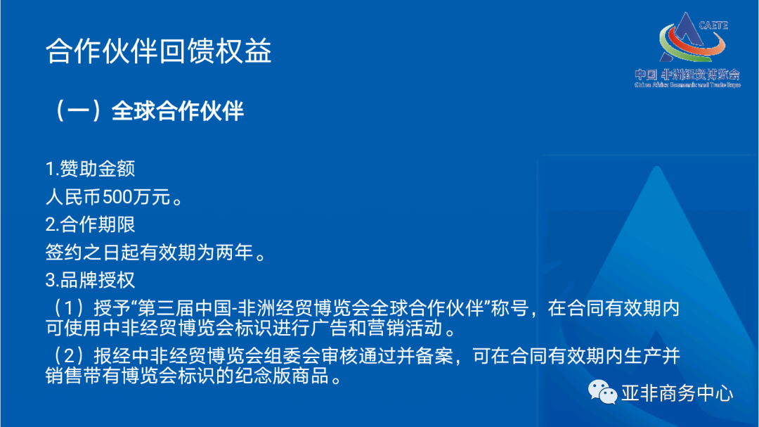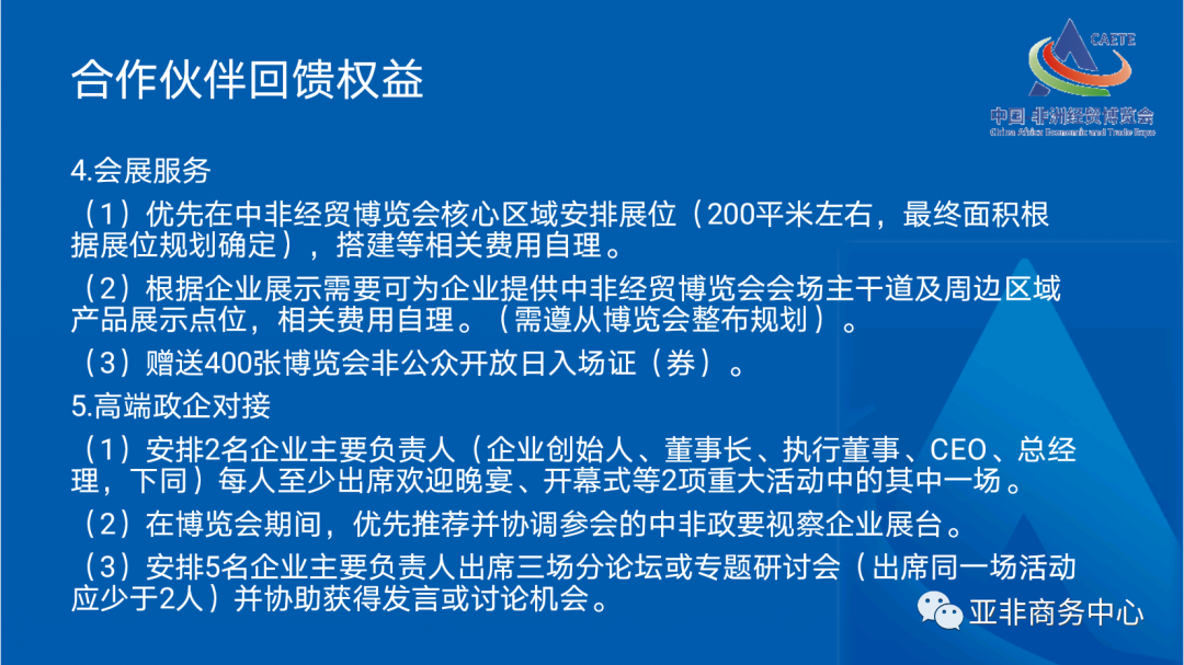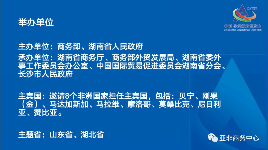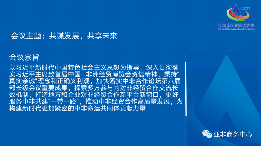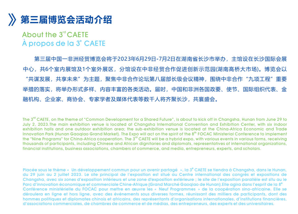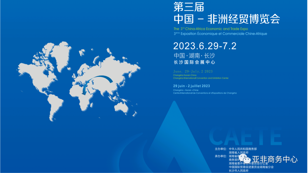 中国-非洲经贸博览会(以下简称“博览会”)是由商务部和湖南省人民政府共同主办,湖南省商务厅、商务部外贸发展局、湖南省委外事工作委员会办公室、中国国际贸易促进委员会湖南省分会、长沙市人民政府承办,旨在探索多方参与的对非经贸合作交流长效机制,打造地方和企业对非经贸合作新平台新窗口,更好服务中非共建“一带一路”,推动中非经贸合作高质量发展,为构建新时代更加紧密的中非命运共同体贡献力量。第三届中国-非洲经贸博览会(以下简称“博览会”)将于2023年6月29日-7月2日在湖南长沙举办。