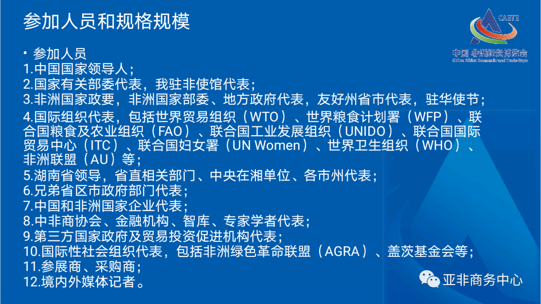 3. Venue: Changsha International Conference Center for the main venue; Changsha International Convention and Exhibition Center for the main exhibition hall; China-Africa Economic and Trade Cooperation Promotion Innovation Demonstration Park (Hunan Gaoqiao Grand Market) for the sub-pavilion