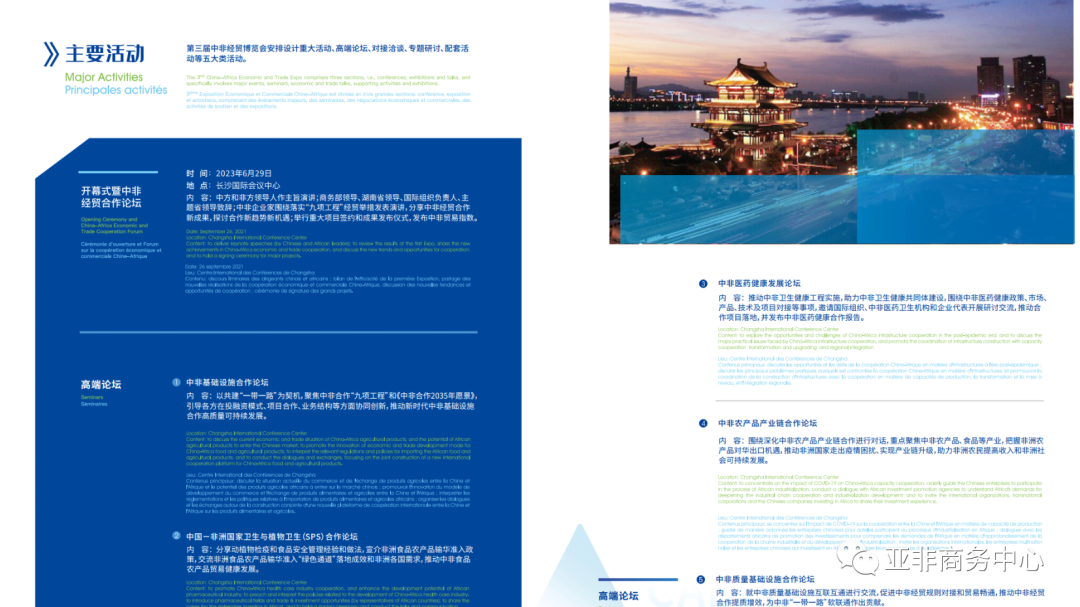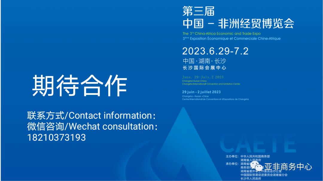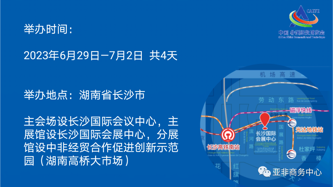 3. Sub-pavilion address: China-Africa Economic and Trade Cooperation Promotion Innovation Demonstration Park (No. 578, Section 1, East Second Ring Road, Changsha City, Hunan Province)
