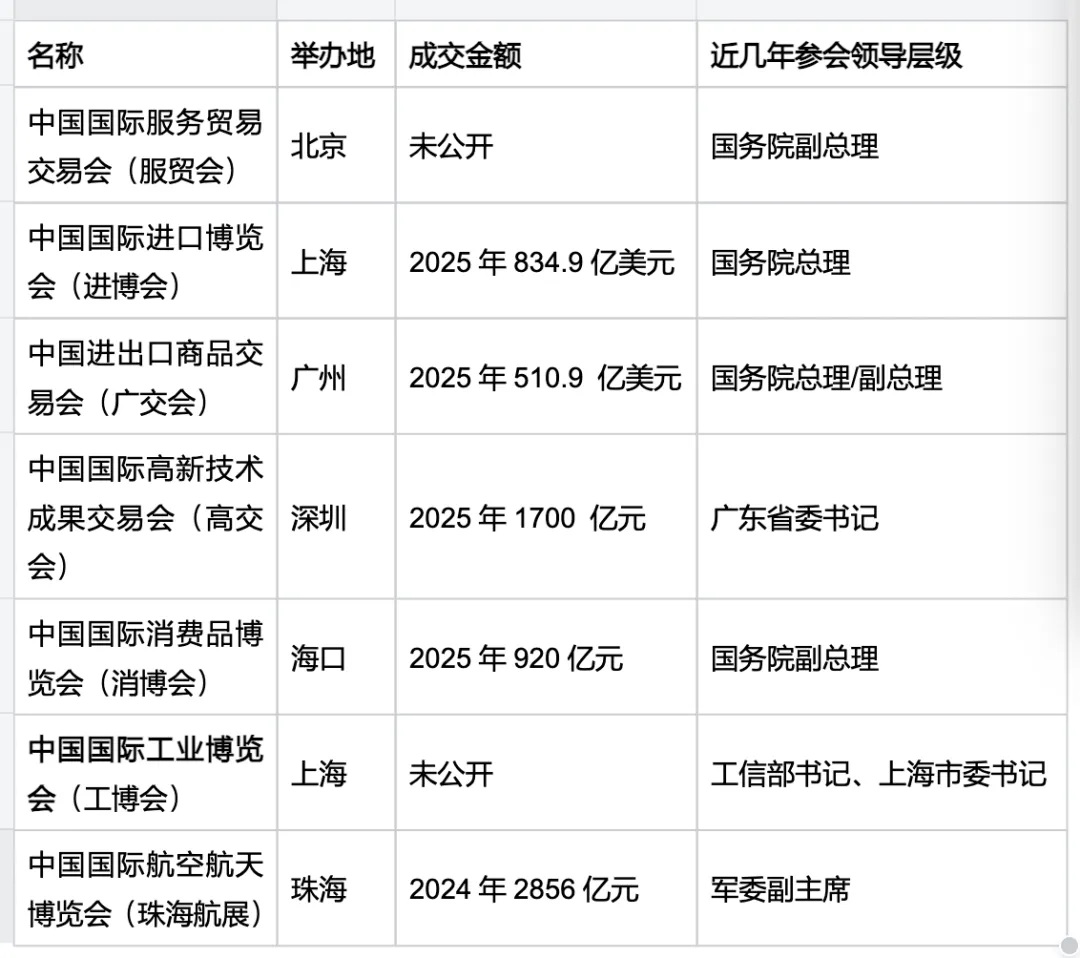 还有一些部委和地方政府主办的一些会议,规格稍微低一些,比如:中国国际工业博览会(工博会,上海)、中国国际数字博览会(数博会,福州)。