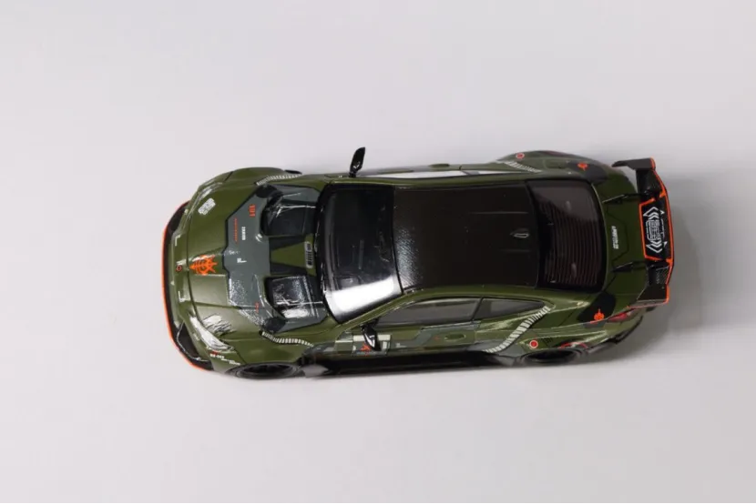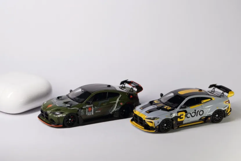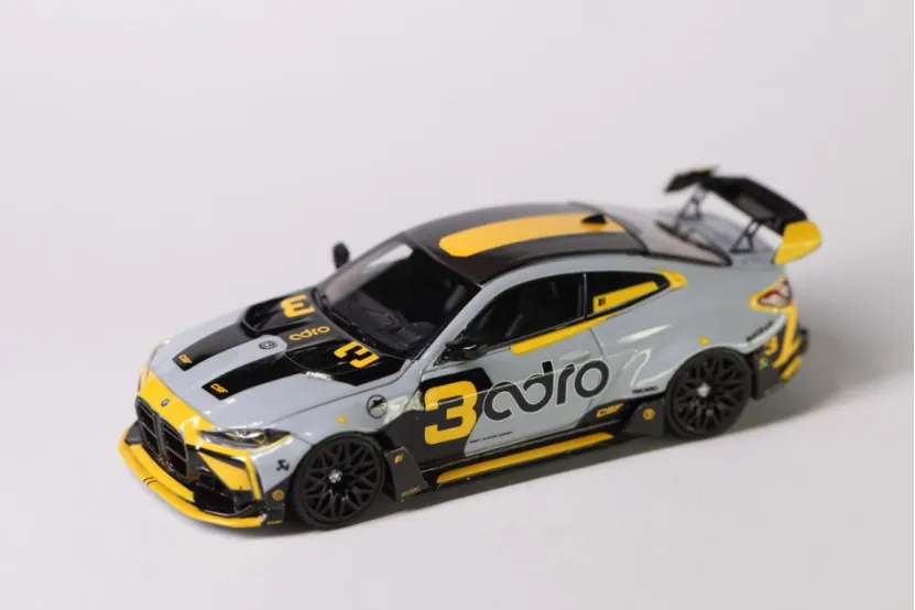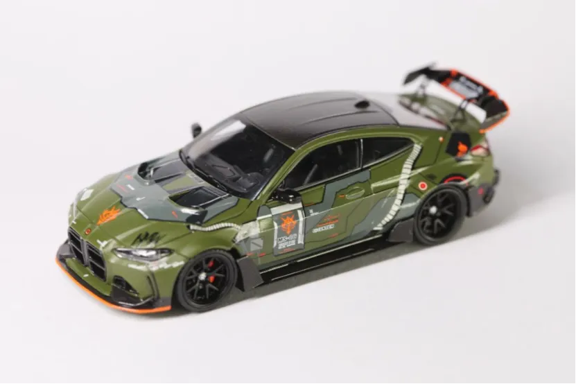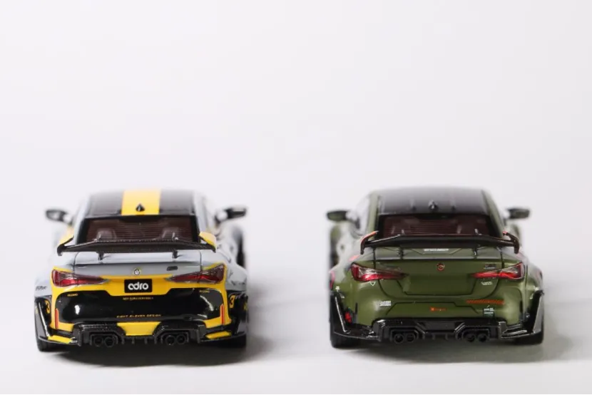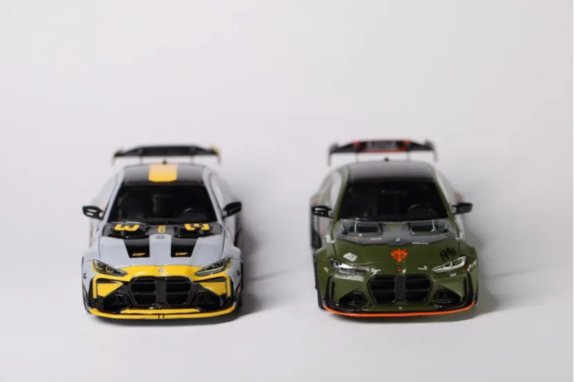 今日到货2台STREET WEAPON的佛山APAxpo改装展M4,与各位客官把玩。近期被各种展会限定刷屏,各类限定模型价格都翻了倍的往上串,而且还不一定买得到。入坑时间不长,突然发现这个圈子变成理财圈子了……碰到喜欢的题材,指不定就是理财款。买吧,被人嘲笑追高,到手了,也变成集邮一样的心态,就是“不管怎么样,这款这么热,我得有!”。不买吧,有些实在喜欢的车型就得放过。入坑入的不是时候啊。另一方面,一直以来对M系列好感满满。Mpower,The ultimate drive machine!宝马的M系列,“平衡”与“操控”的底线。对于能买得起的车型,都会收入麾下。这2台恰巧刷到,价格也能接受,就入手了。SW的3号拼色涂装与绿色扎古涂装M4,以截然不同的风格诠释了M4的多元魅力,既是对改装文化的致敬,也是模型工艺与艺术表达的完美融合。模型还原了ADRO宽体套件的核心特征:前后轮拱外扩,搭配深灰色多辐轮毂与红色刹车卡钳,肌肉感十足;碳纤维前唇、侧裙、后扩散器及天鹅颈式双层扰流板,均通过合金材质与涂装实现“以假乱真”的质感,甚至前格栅的“双肾”造型都做了镂空处理。3号拼色涂装以“赛道基因”为设计内核,采用银灰与亮黄的双色拼接涂装,车身侧面的流畅色块分割线如同“速度撕裂空气”的轨迹,搭配黑色车顶与后视镜,营造出强烈的运动感。前唇、侧裙及尾翼端板的亮黄色点缀,不仅呼应了M4 Competition的竞技属性,更通过高对比度色彩提升了视觉冲击力。绿色扎古涂装则是“科幻战士”。灵感源自《机动战士高达》中的经典机甲“扎古”,车身以军绿色为主色调,搭配橙色前唇、侧裙饰条和HRE轮毂,仿佛从未来战场驶来的“移动堡垒”。车体上几处红色标志,将机甲元素与汽车改装巧妙结合。军绿色的哑光质感搭配橙色饰条,既保留了M4的竞技基因,又通过科幻元素打破了传统改装车的刻板印象,成为跨界联名之作。