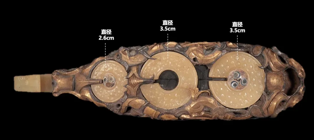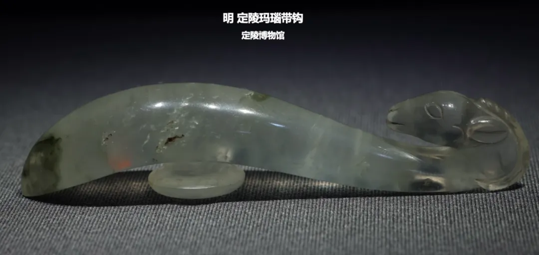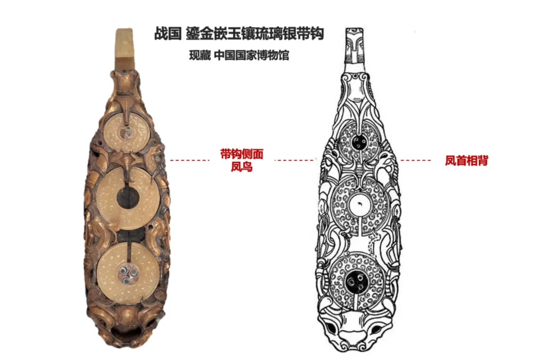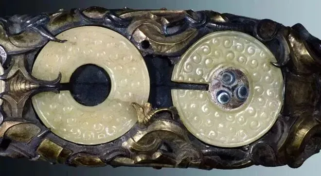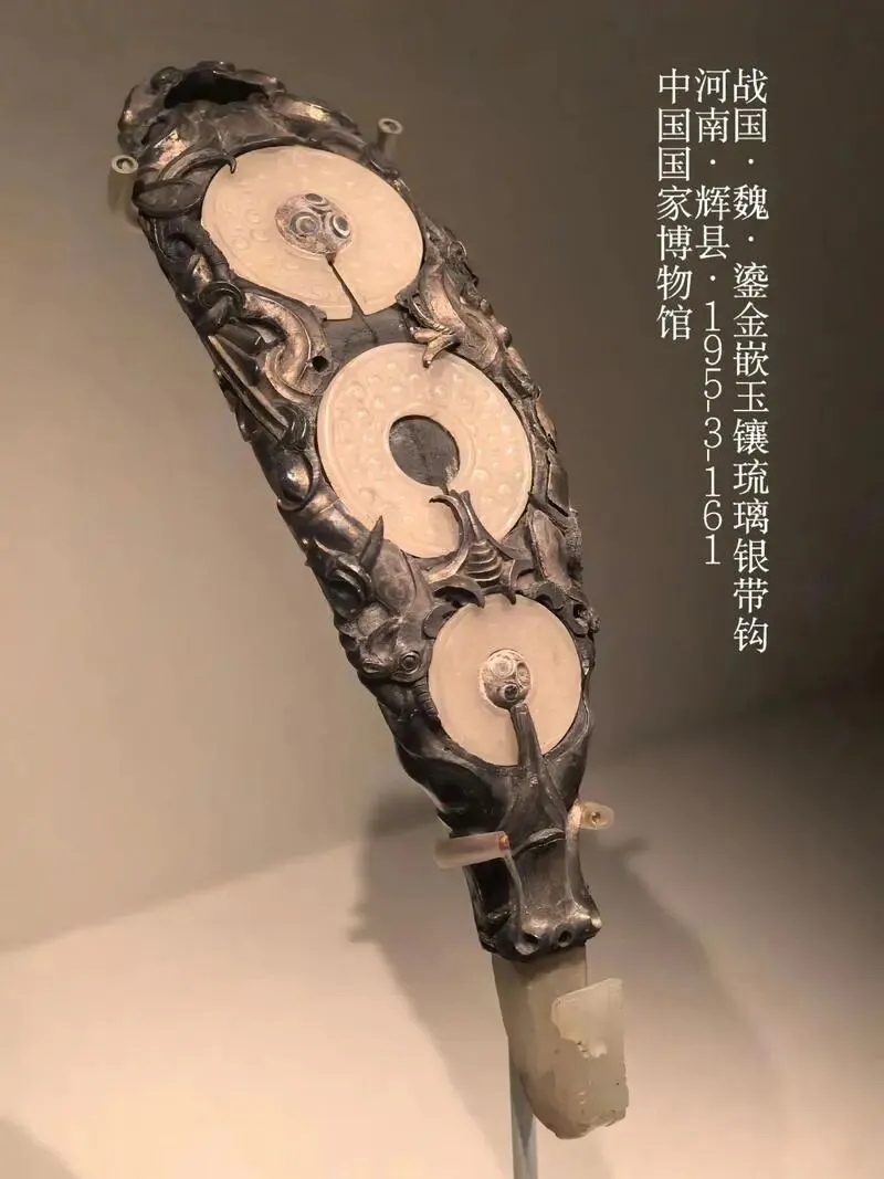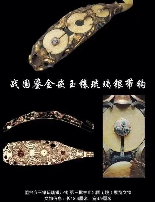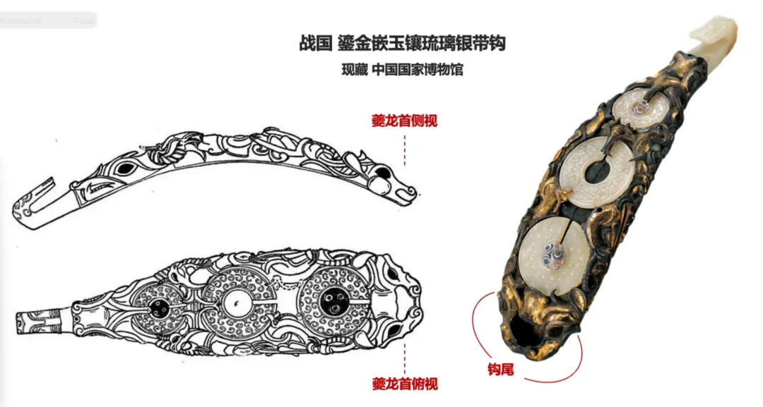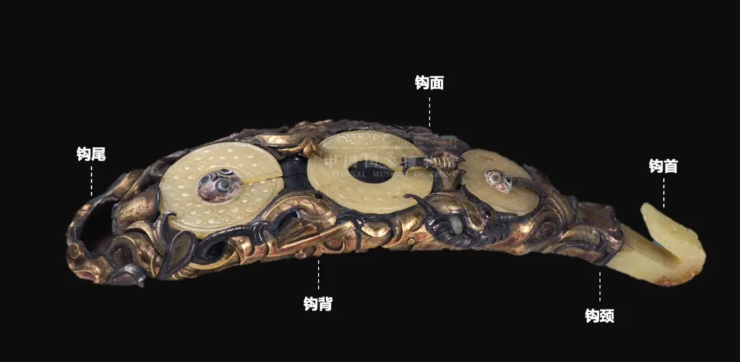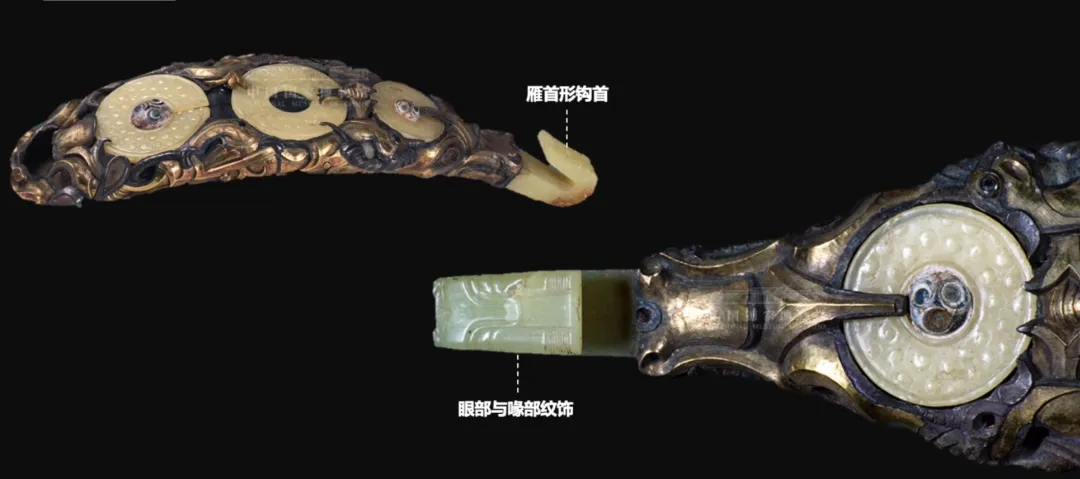 带钩主体分为钩首、钩身和钩纽三部分:钩首为白玉雕琢成的雁首形,从侧面看宛如一只曲颈高歌的鸿雁,造型生动,寓意吉祥;钩身正面镶嵌三枚青白色白玉玦,每枚玉玦中心均嵌有一粒半球形蜻蜓眼琉璃珠(又称“琉璃眼”),具有强烈的视觉装饰效果;带钩的钩纽位于钩身背面中部,为圆形或方形的凸起钮状结构,用于固定在腰带上,使带钩整体发挥束带功能。