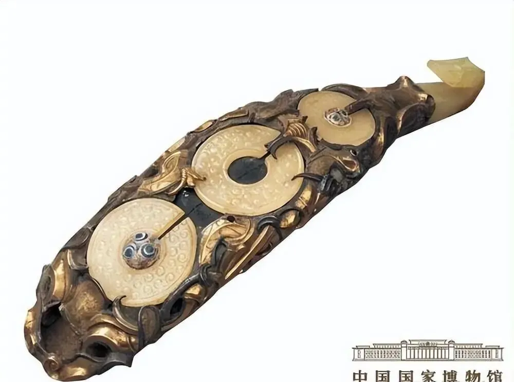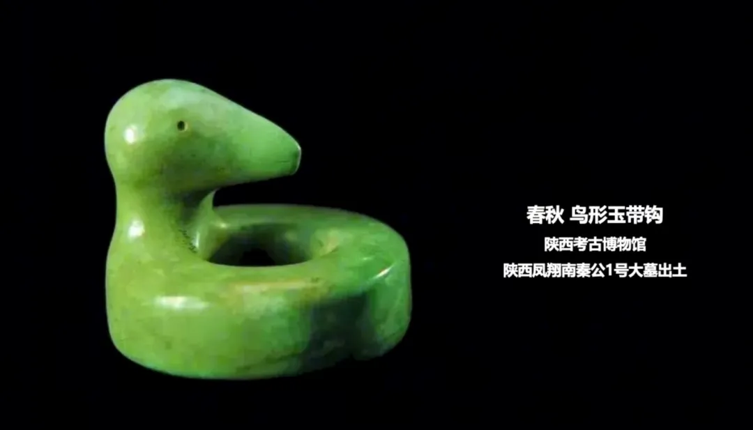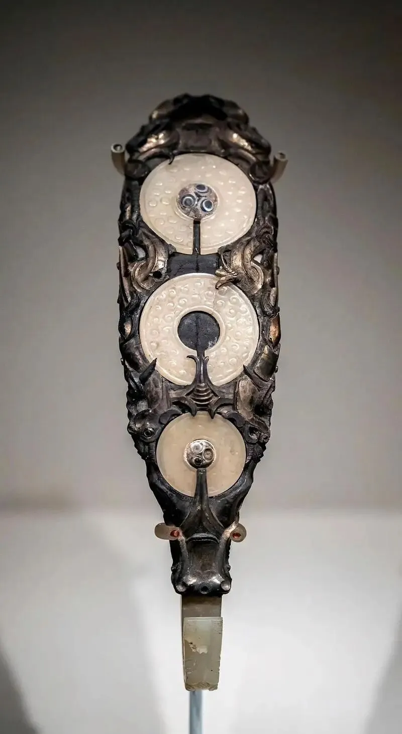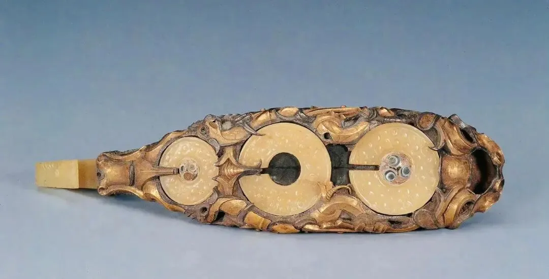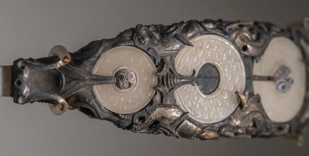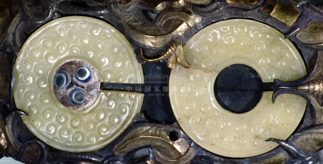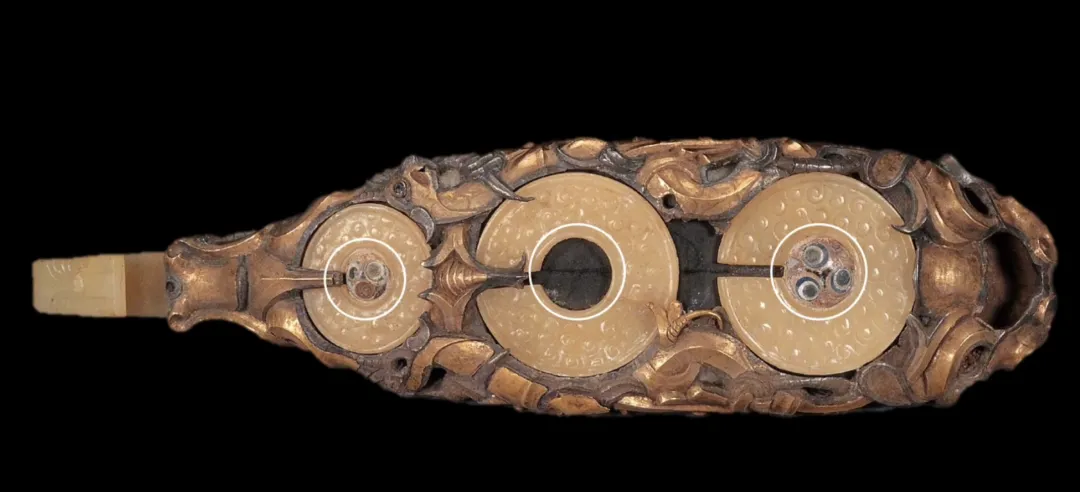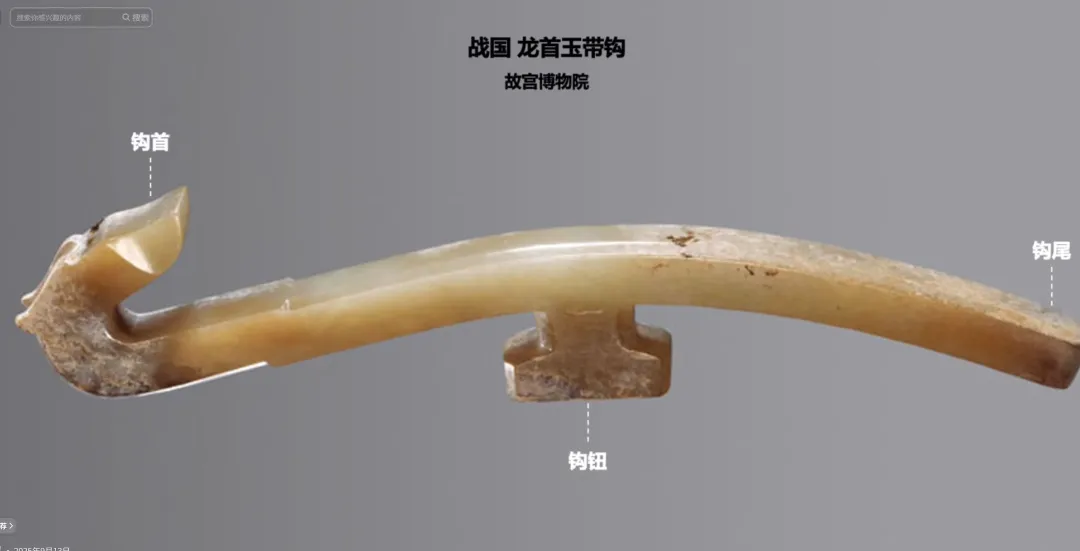 带钩主体分为钩首、钩身和钩纽三部分:钩首为白玉雕琢成的雁首形,从侧面看宛如一只曲颈高歌的鸿雁,造型生动,寓意吉祥;钩身正面镶嵌三枚青白色白玉玦,每枚玉玦中心均嵌有一粒半球形蜻蜓眼琉璃珠(又称“琉璃眼”),具有强烈的视觉装饰效果;带钩的钩纽位于钩身背面中部,为圆形或方形的凸起钮状结构,用于固定在腰带上,使带钩整体发挥束带功能。