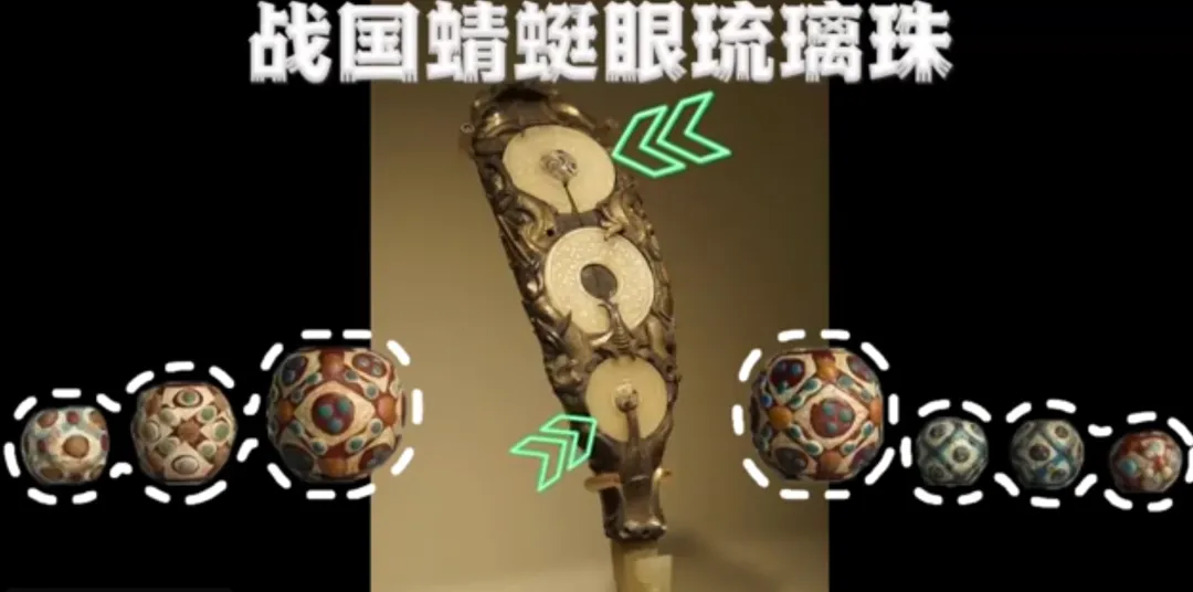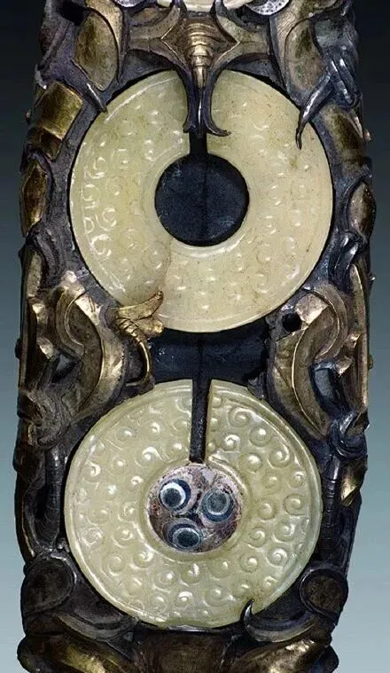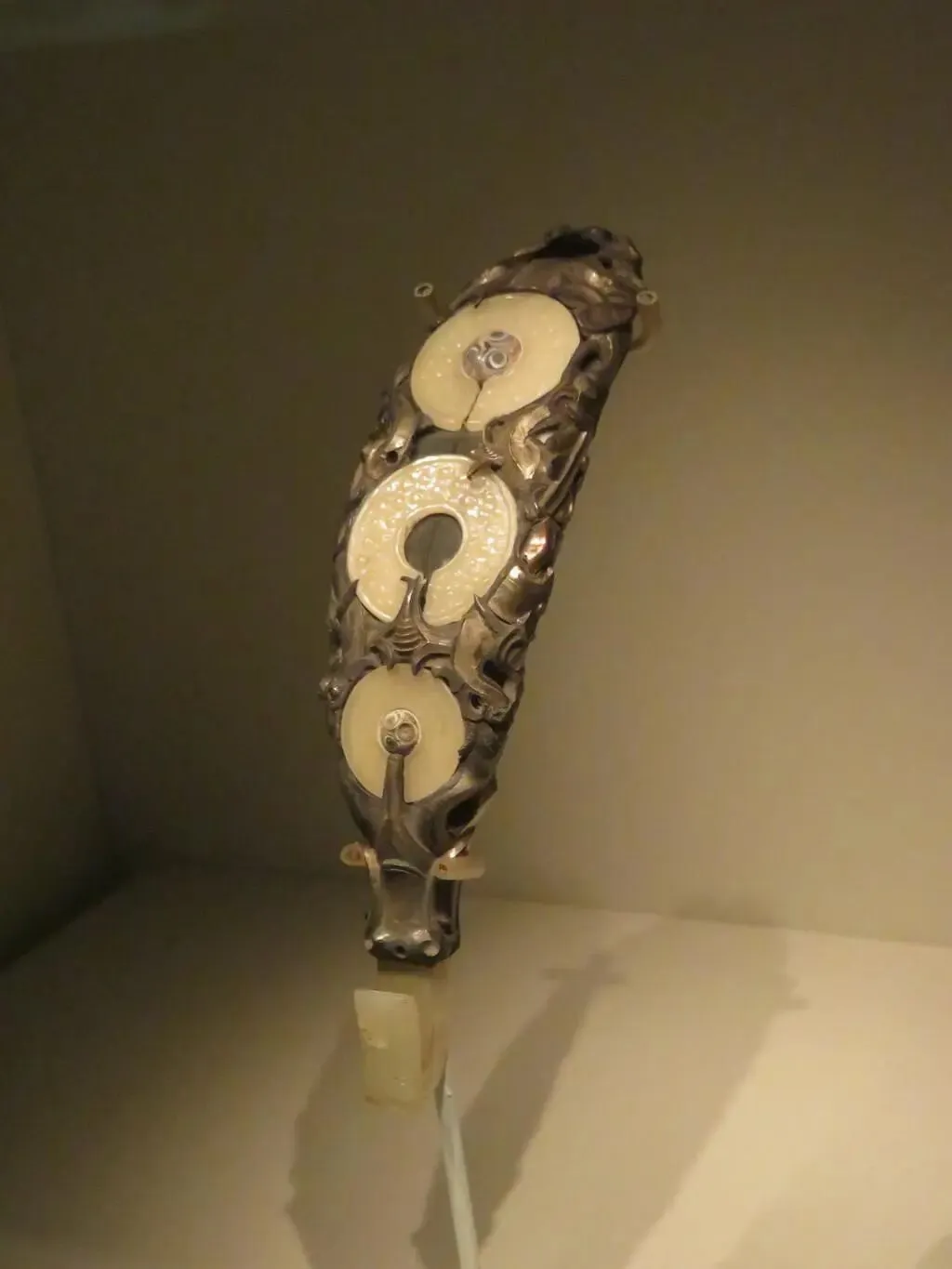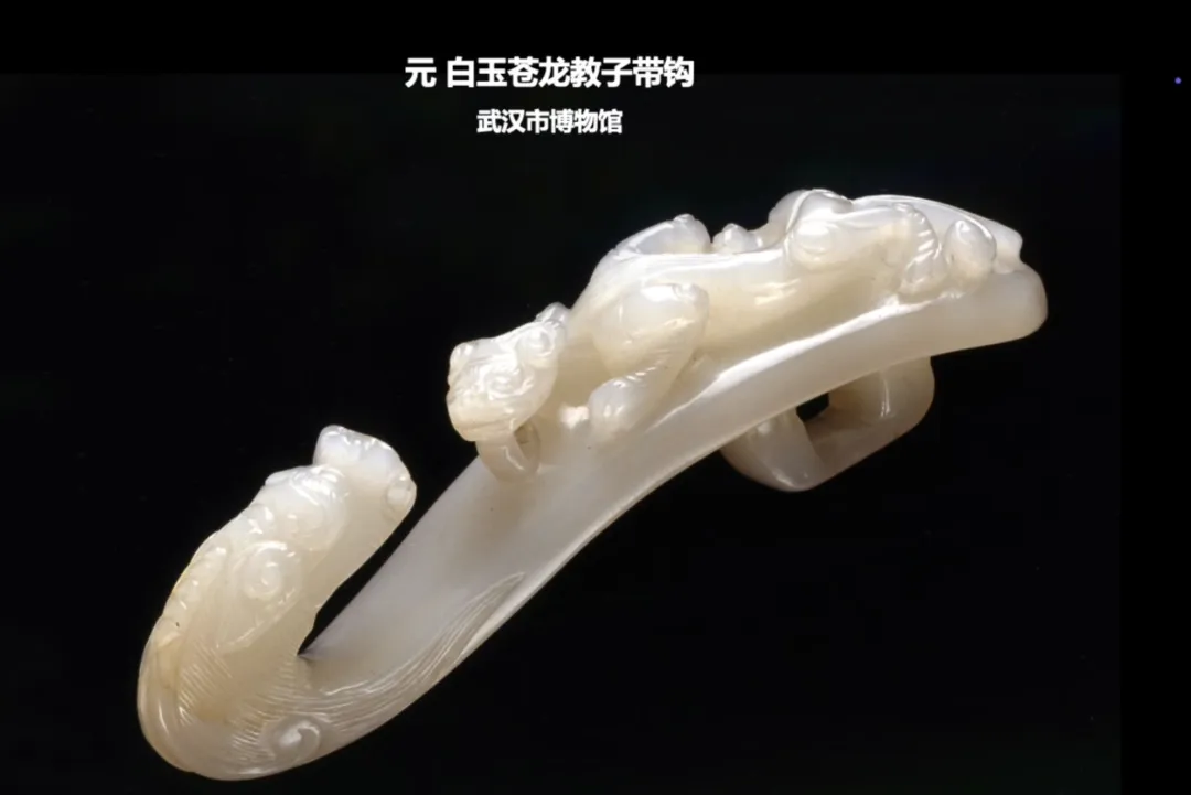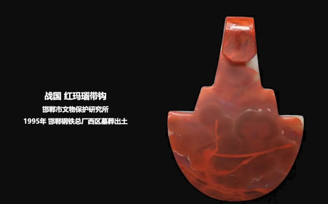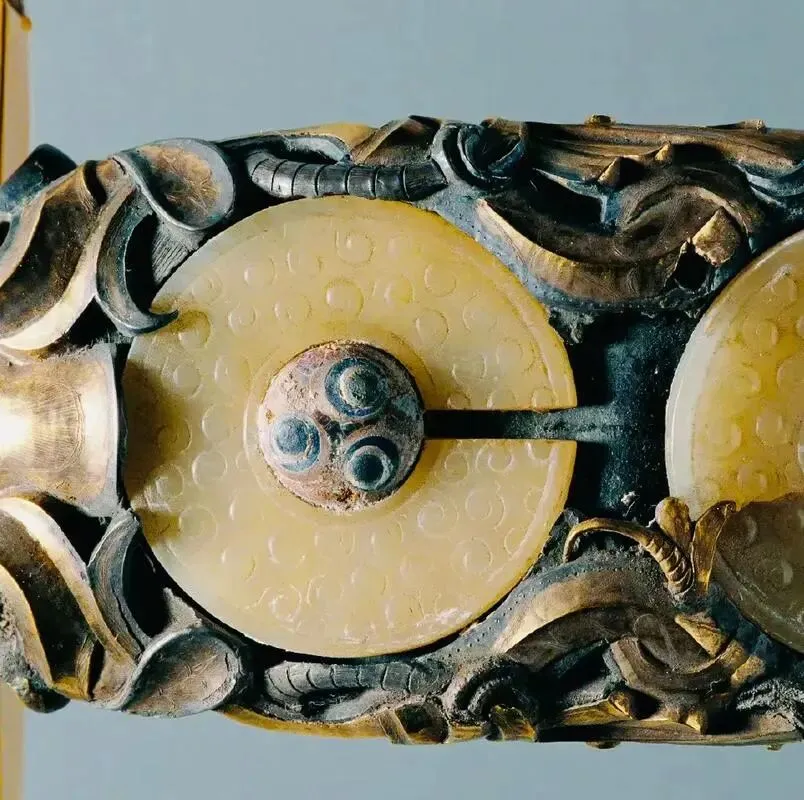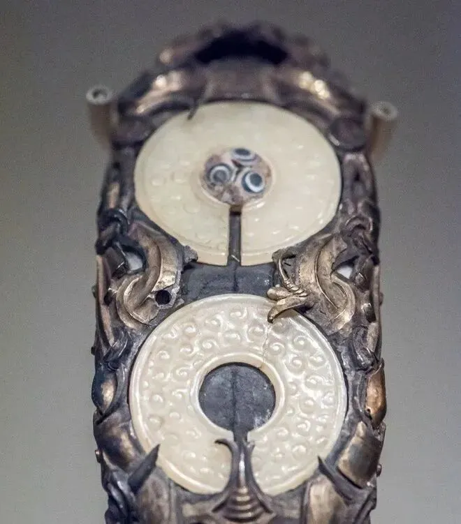 带钩主体分为钩首、钩身和钩纽三部分:钩首为白玉雕琢成的雁首形,从侧面看宛如一只曲颈高歌的鸿雁,造型生动,寓意吉祥;钩身正面镶嵌三枚青白色白玉玦,每枚玉玦中心均嵌有一粒半球形蜻蜓眼琉璃珠(又称“琉璃眼”),具有强烈的视觉装饰效果;带钩的钩纽位于钩身背面中部,为圆形或方形的凸起钮状结构,用于固定在腰带上,使带钩整体发挥束带功能。