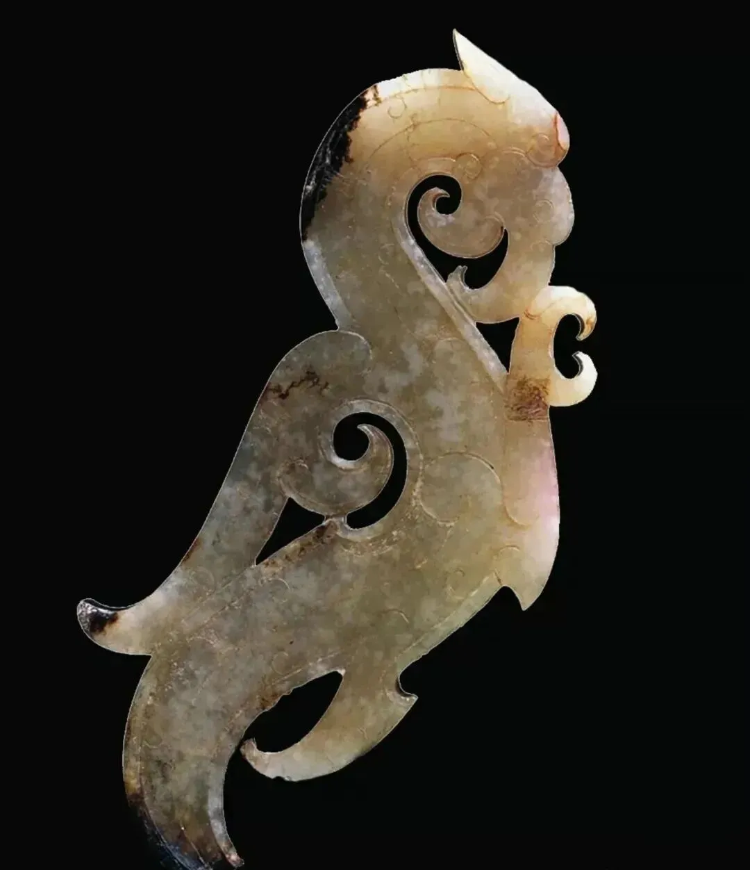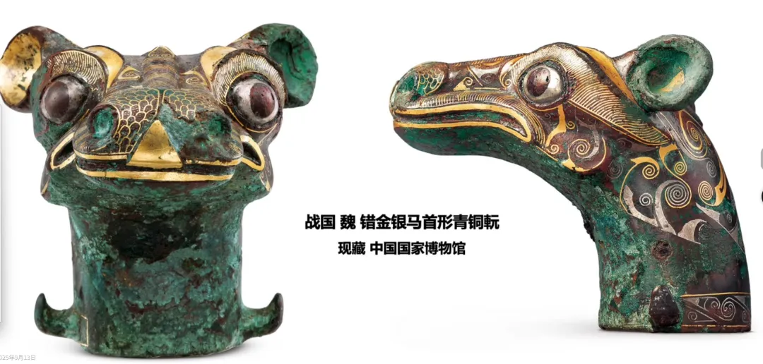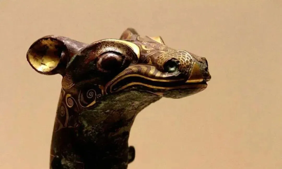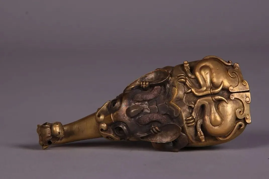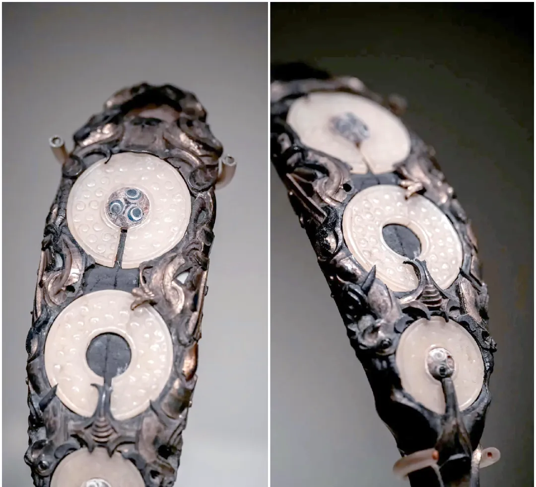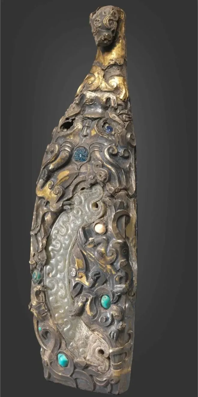 纹饰工艺极为繁复,采用浮雕、透雕、镶嵌、凿刻等多种技法,饰有兽首、长尾鸟、夔龙、凤鸟等动物纹样,两侧盘绕的夔龙与凤鸟方向相对,形成对称而灵动的布局。