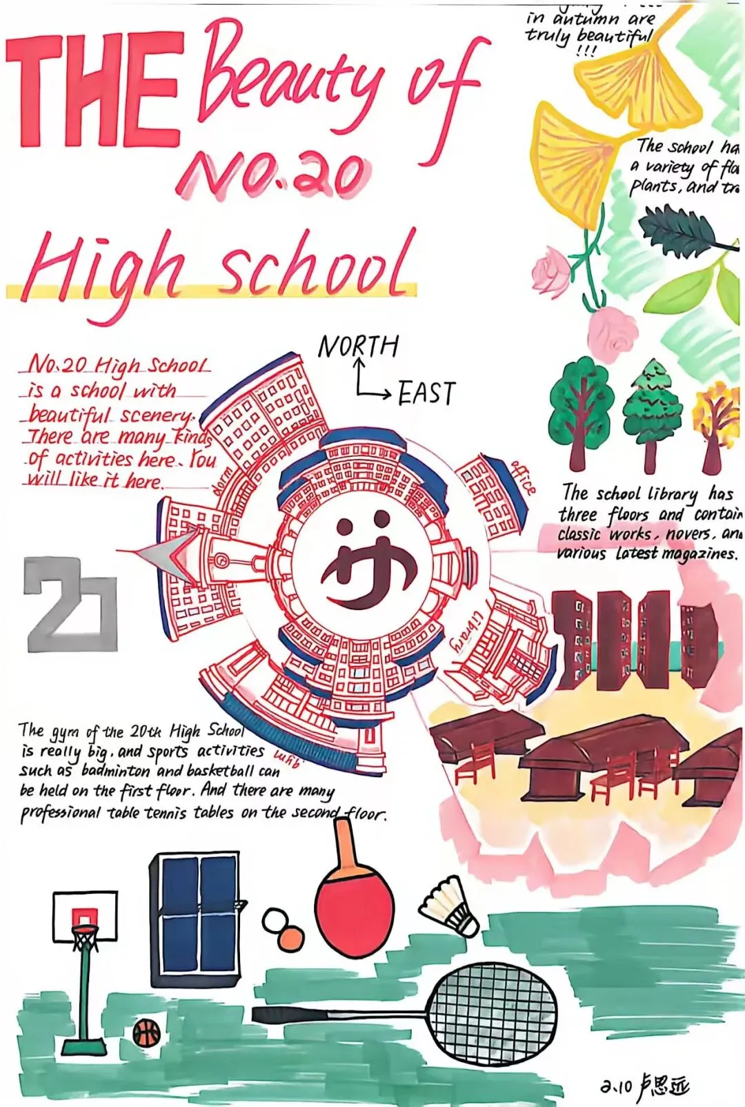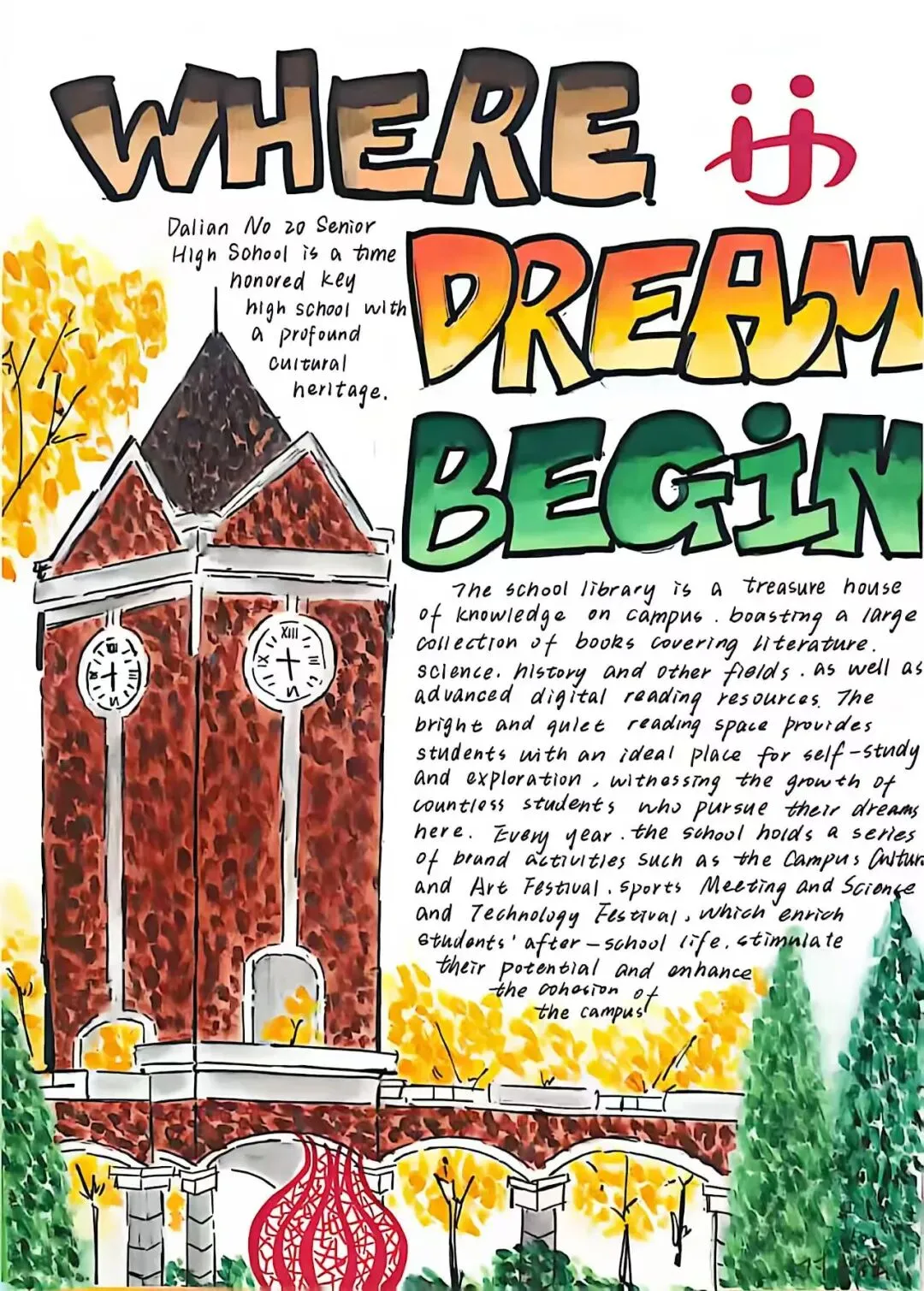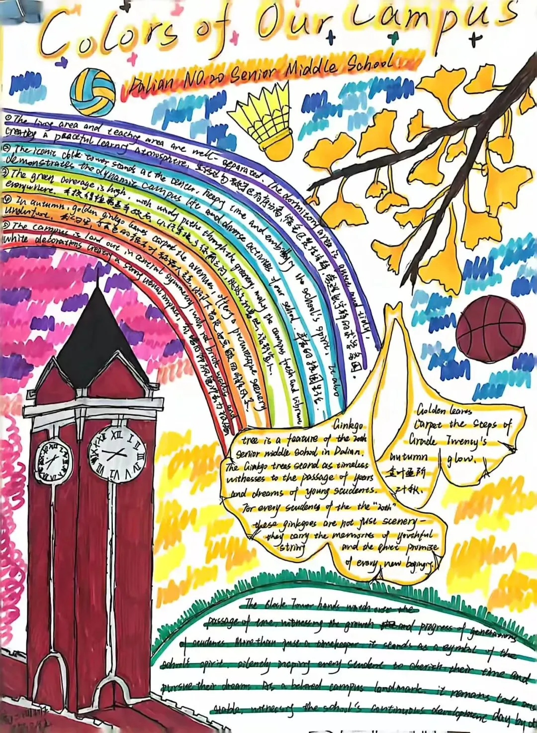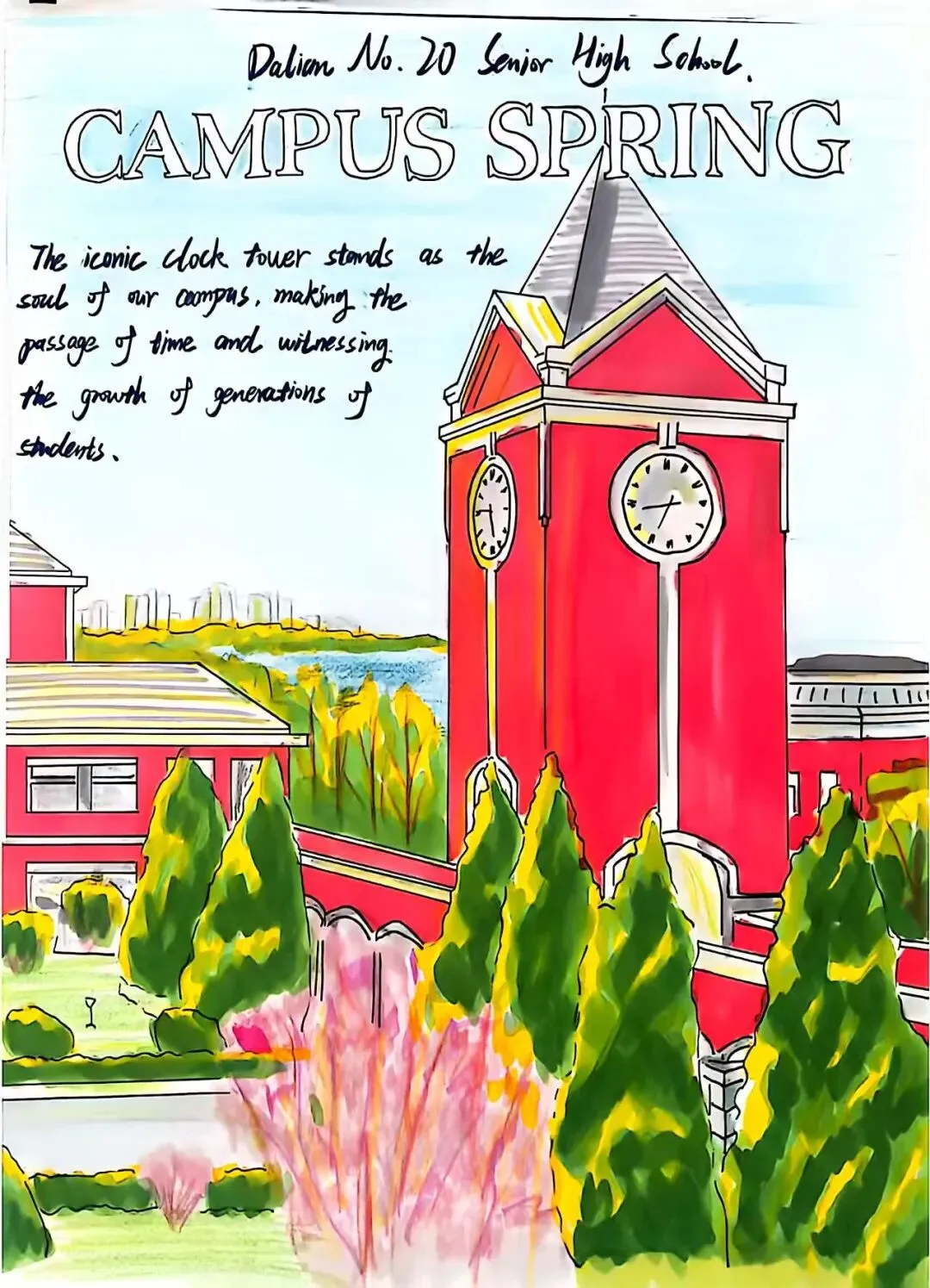 为提升学生英语综合运用能力,展现学校校园文化与精神风貌,大连市第二十高级中学高二英语组近日成功举办了“See Our Campus, Feel Our Spirit”校园风貌英文海报设计大赛。同学们用英语与艺术,绘出了一张张属于我们学校的“最美名片”。
