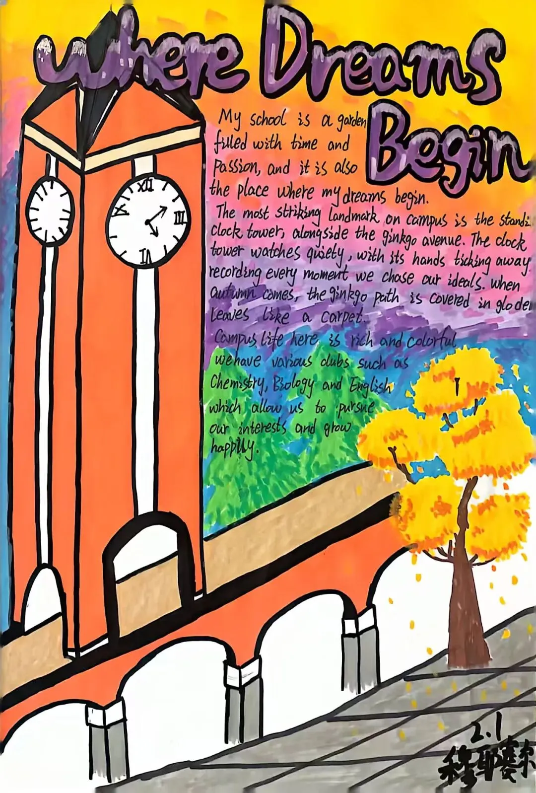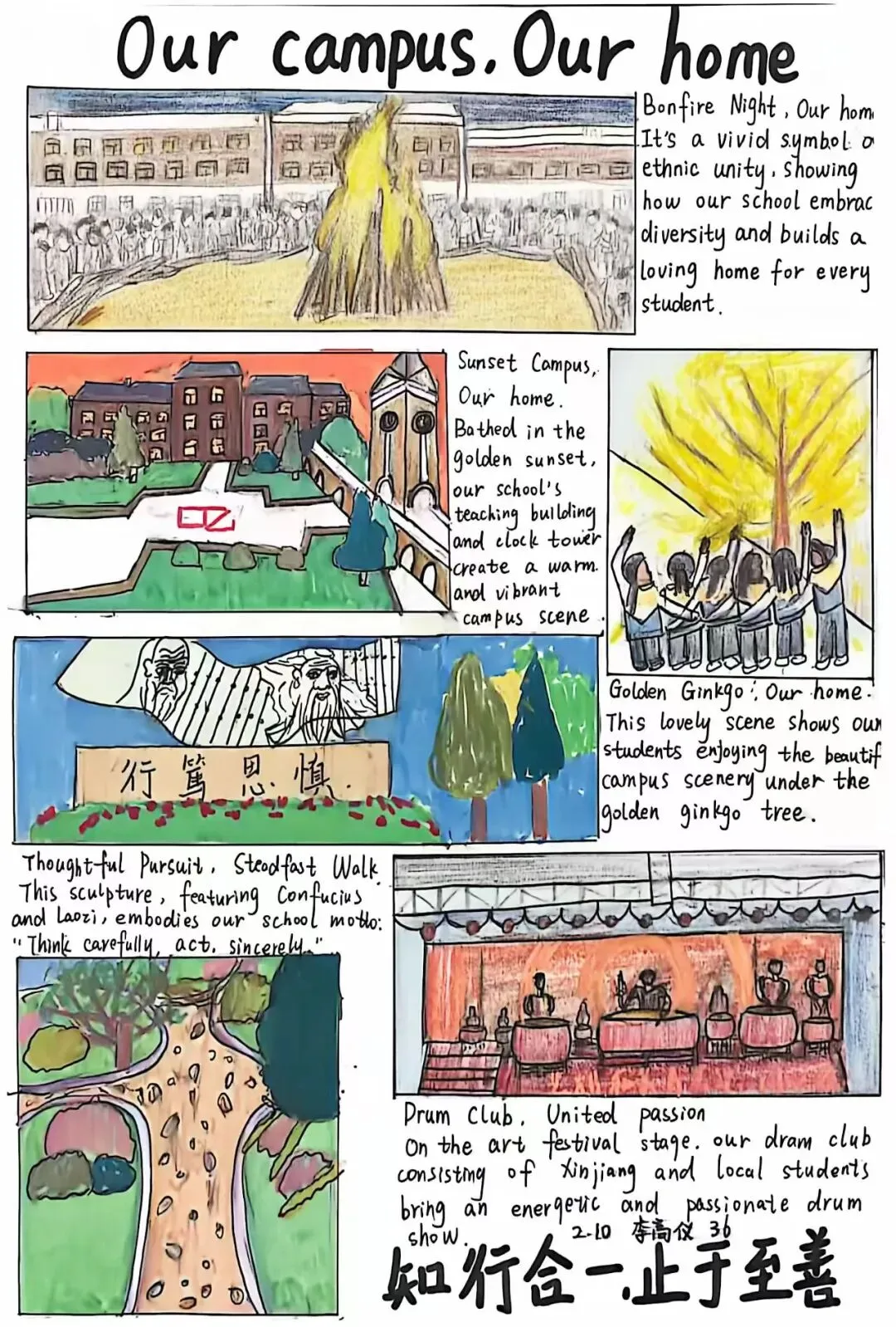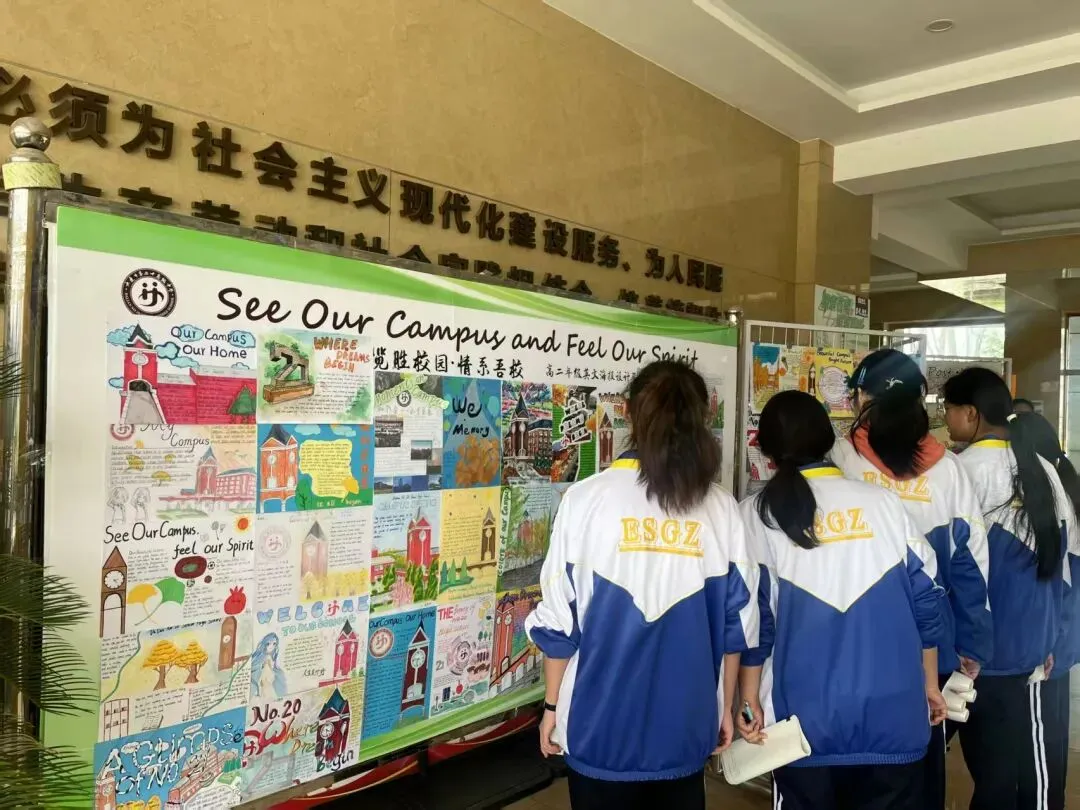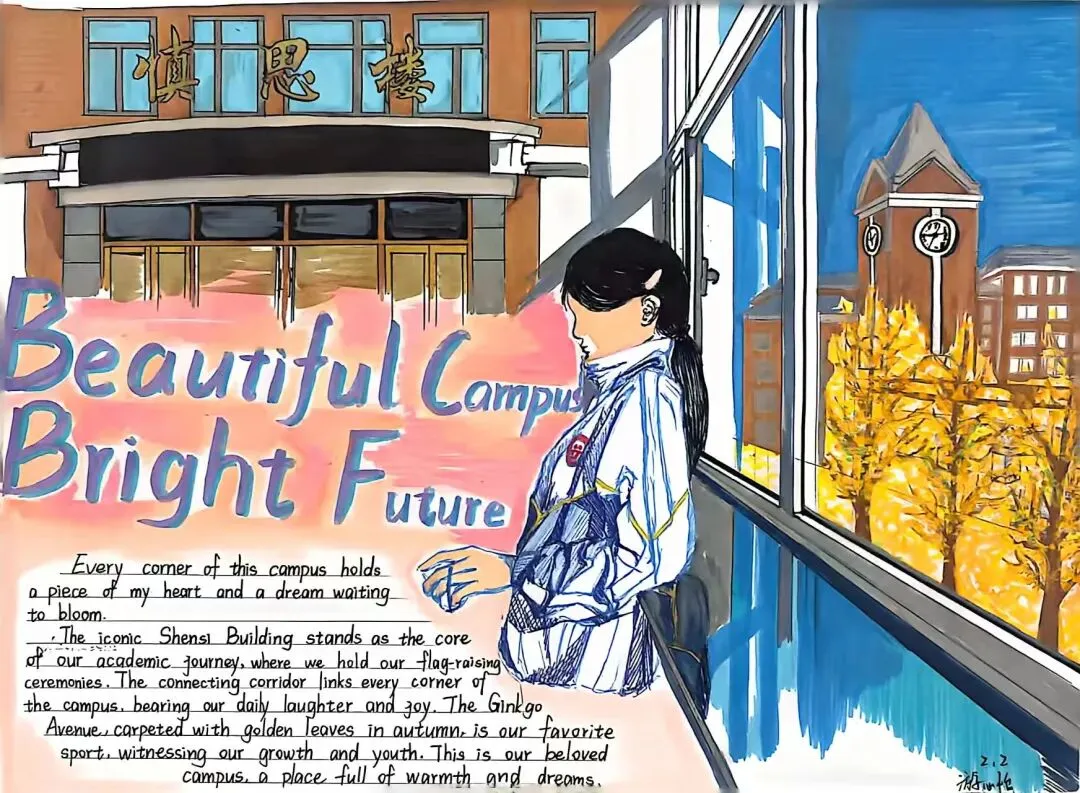 本次活动一经启动,便得到高二全体学生的积极响应。同学们化身校园文化传播者,自主创作地道英文文案,精准呈现校园特色;融合手绘、数字设计等多元形式,将校园地标、课堂风采、社团活动等场景融入作品,打造出兼具语言专业性与视觉观赏性的校园文化名片,充分展现了扎实的英语功底与饱满的创作热情。