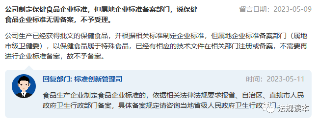 公司生产已经获得批文的保健食品,并根据相关标准制定企业标准,但属地企业标准备案部门(属地市级卫健委),以保健食品属于特殊食品,已经有相应的技术文件在相关部门注册或备案,不需要再进行企业标准备案,故不予备案。