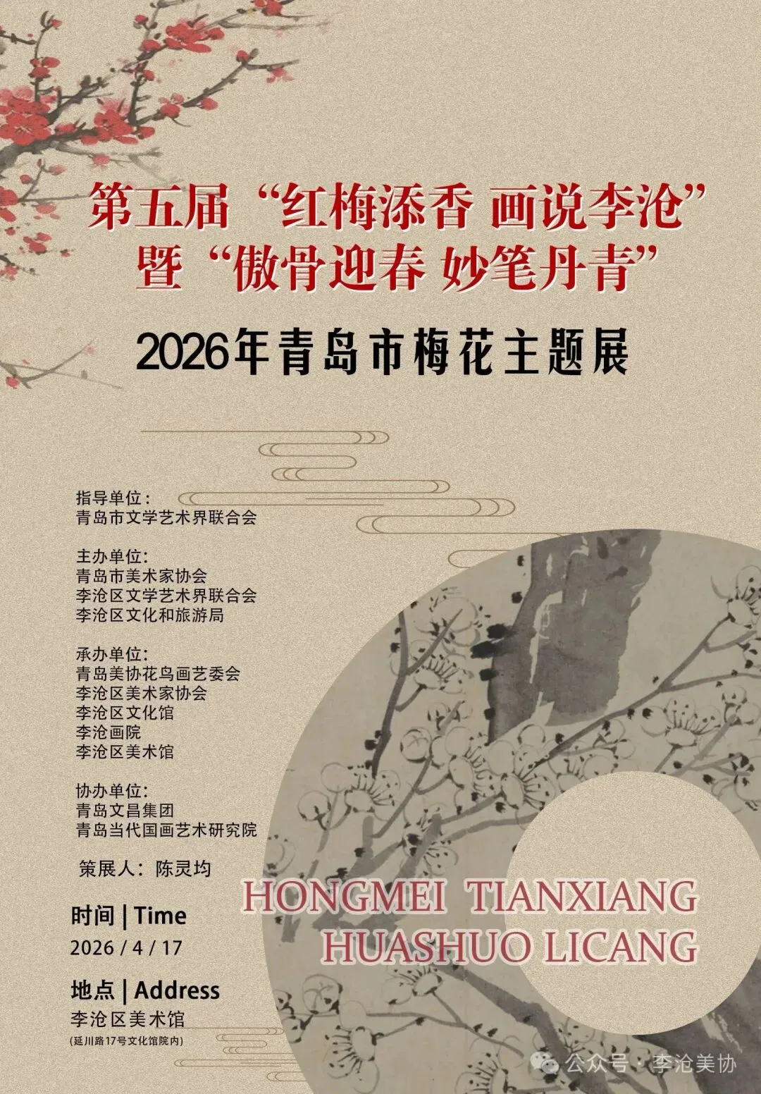 第五届“红梅添香 画说李沧”暨“傲骨迎春 妙笔丹青”2026年青岛市梅花主题美术作品展评选工作于4月7日在李沧区文化馆举行。