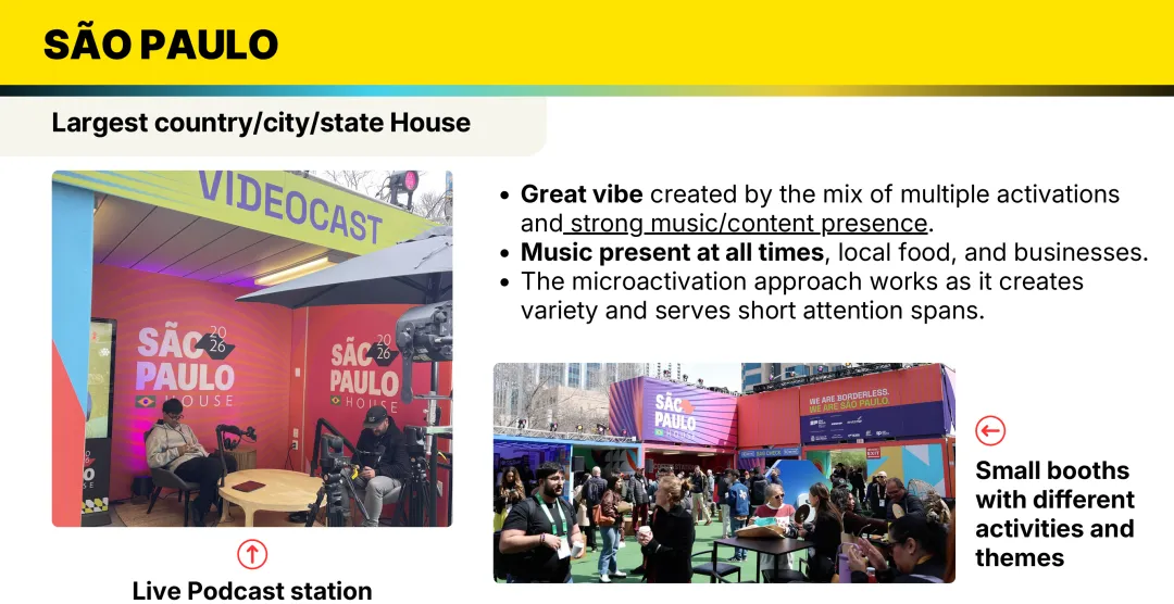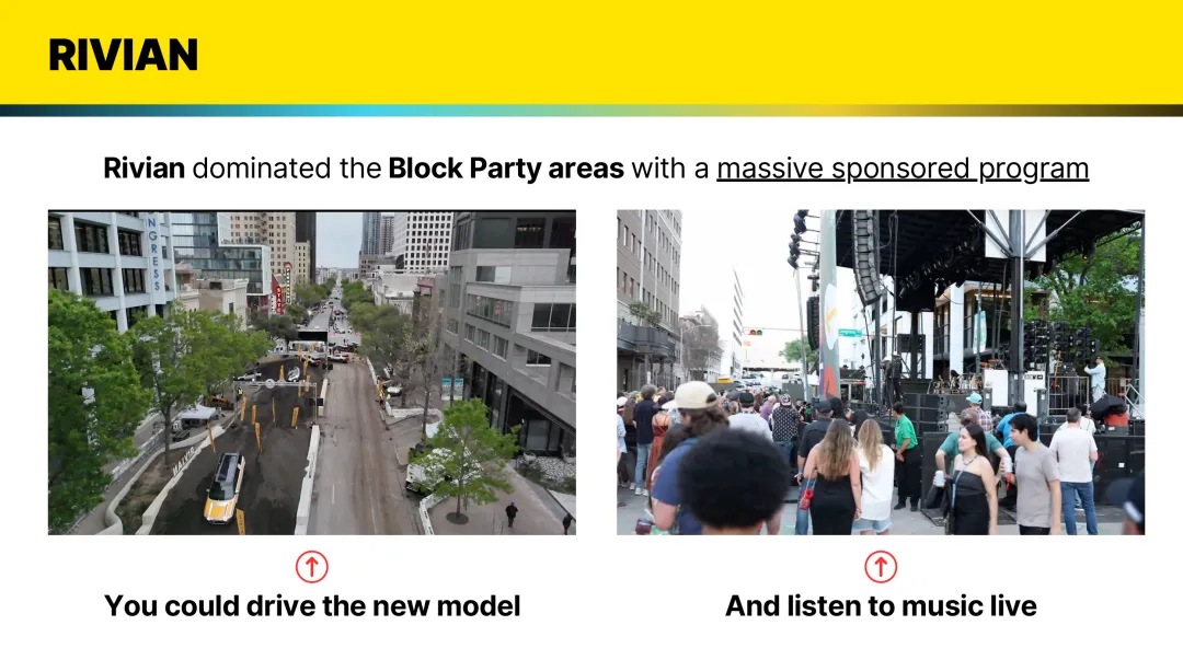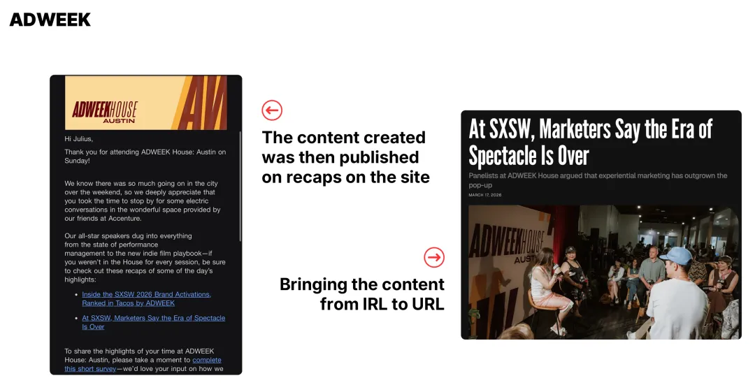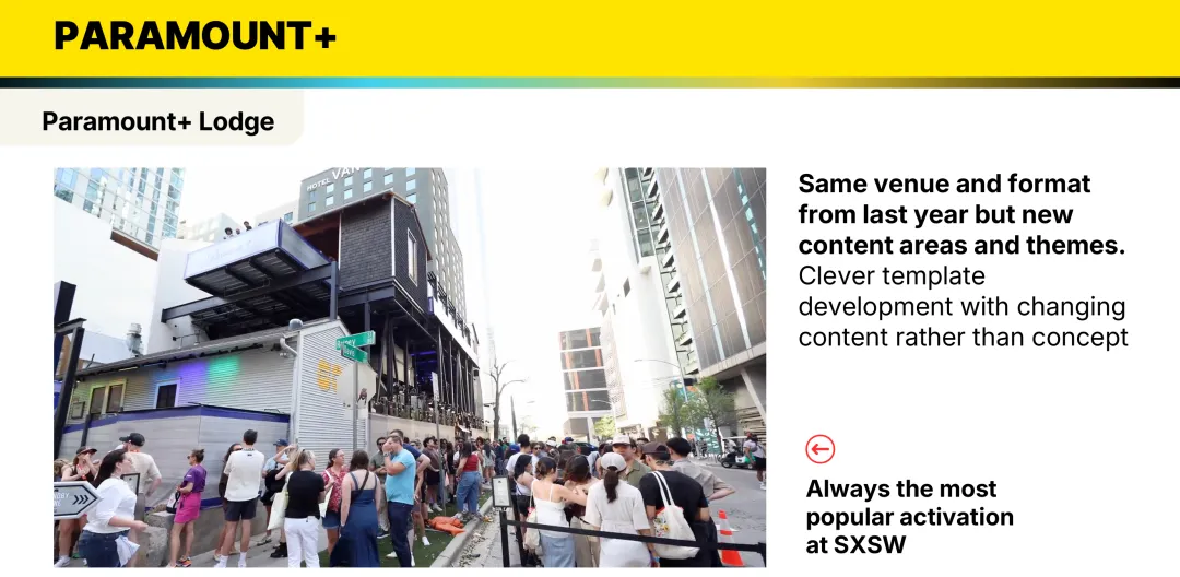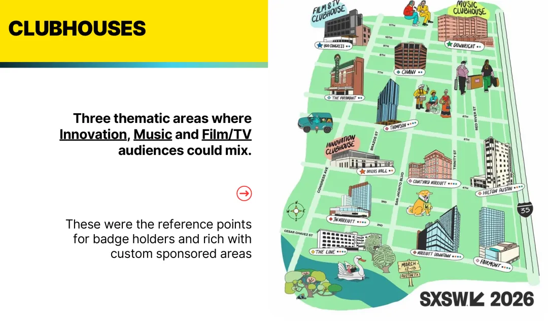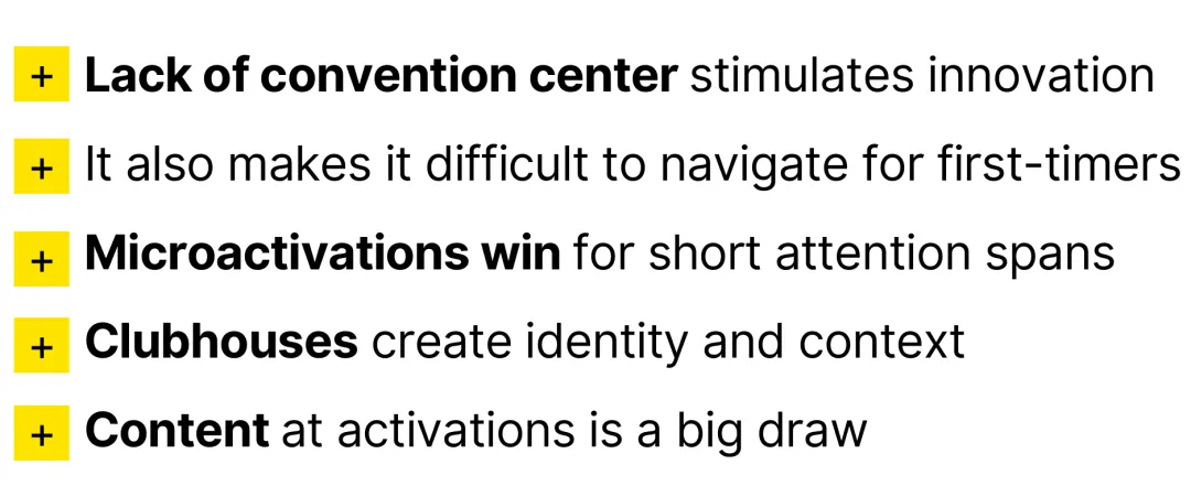 我是 Julius Solaris,这是你能读到的关于年度最重要活动最诚实的解读。欢迎来到 2026年西南偏南大会SXSW 。✅ 今年没有会展中心,反而激发了创新 —— 但也让第一次来的人彻底 懵 圈✅ 微型激活( Microactivations )大获全胜 —— 短注意力时代,这才是正解✅ Clubhouse 模式创造了身份认同与场景感SXSW 在活动开始前就做了一件聪明的事 —— 发了一份预活动体验调研问卷。 为什么这很重要? 因为它帮助主办方在活动开始前就校准了参与者的期望值,建立了基线数据。问卷设计合理,激励机制也到位 —— 完成填写就有机会赢得 $50 礼品卡,大奖是一对 2027 年的白金徽章。 值得学习。今年特别值得关注的一个群体是"首次参会者"。没有会展中心,整个城市就是会场,这对新人来说简直是噩梦级别的挑战。SXSW 为此制作了专属的新人引导页面,解释了不同徽章的权限,列出了活动时间表,给出了入场和领取徽章的完整指引。我要给这份新人 引导页打高分 。 如果再配上一个视频 Walkthrough,就完美了。历史上,SXSW 的地图一直是一场"认路噩梦"——分散、复杂、 令人抓 狂。今年,团队明显花了精力去改善这个问题。"我已经到了,然后呢?" —— 这个问题他们终于认真对待了。这不是什么新鲜事,SXSW 的地图一直都让人困惑。但今年是第一次,他们真的努力让事情变得清晰一点。 方向对了。未来四年,SXSW 都不会有会展中心(在翻修改造)。这听起来像是一场灾难。实际上,它是今年最大的惊喜。没有会展中心,意味着什么?意味着团队被迫重新定义"活动"本身。这种压力,让他们把奥斯汀这座城市变成了舞台。结果就是: SXSW 2026 更像一个来自未来的活动,而不是过去的那个版本。当然,代价也是真实的 —— 部分参会者,尤其是第一次来的人,真的在城市里迷失了。没有中心,没有锚点,很容易不知道该往哪走。从"一对多"的传统展会模式 → 走向"去中心化的微型活动生态"2025 年的模型:一个主活动 + 围绕它的一圈参展商。 单向输出,静态展示。2026 年的模型:一个主活动框架下,无数个微型活动节点同时运转,彼此连接,互相激活。 这才是未来。Clubhouse —— 三个主题聚合区,是今年 SXSW 最重要的结构性创新。这三个区域,分布在奥斯汀城市的不同地点,成为了徽章持有者的"参考坐标"。每个区域内,都有:Clubhouse 的意义远不止于"提供一个空间"。它创造了身份认同,让人知道自己属于哪个圈子,让赞助商有了精准的受众对接场景。 有主题,有归属,有上下文 —— 这才叫设计。国会大道的一段被封路了。对,就这么简单粗暴,也这么令人兴奋。这片区域专门用于品牌体验和内容活动。 把街道变成会场,这是活动设计最前沿的玩法之一。Boldpush 也是今年合作伙伴项目的参与方之一。合作伙伴内容项目非常成功,库存全部售罄。 一个字:供不应求。这一条我要单独提出来表扬 —— SXSW 团队今年在各个场馆为 ADA(残障人士)专门保留了优先座位。这是专业活动团队该有的基本责任感。 做得好。Rivian 今年在 Block Party 区域的赞助规模是压倒性的。你可以亲手驾驶 Rivian 的新车型,同时还有现场音乐助阵。 体验 + 产品 + 娱乐,三合一,干得漂亮。PwC 的玩法是这样的:先答题,答对了才能玩抓娃娃机。奖品包括袜子、礼品卡和收藏品。排队的人很多。概念很好,但有一个明显的 遗漏 :没有收集邮件。给了这么好的一个数据采集机会,结果就这么放掉了。Zoom 的激活围绕着一件事:赢得一只 Labubu 。参与方式是填写信息表单,换取免费小礼品,同时参与 Labubu 抽奖。奖品还包括风扇、水杯和 Tote Bag。合理的数据收集逻辑 —— 你要给出礼品,当然要尽量多收信息。 表单问题有点多,但从品牌获取用户数据的角度来说,完全说得通。唯一的问题是,现场的 Zoom 品牌 感有点弱 ,存在感不够突出。Cloudflare 找了一位艺术家专门创作了"音乐吊床"。非常受欢迎,人气很旺。这和 Cloudflare 的品牌到底有什么关系?这是个让人挠头的问题。人气高,品牌关联度低。做激活,有人气是第一步, 但别忘了讲品牌故事。Adweek 与埃森哲联合呈现,场地设在埃森哲的办公室内。今年 Adweek 做了一个 纯内容型 的选择 —— 不搞花哨的体验激活,专注于内容输出。而且在空间设计上非常用心: 圆形舞台,演讲者和观众围坐一圈,像在进行一场平等的讨论,而不是单向的演讲。这种设计极其适合录制传播内容。活动结束后,这些内容被整理发布到网站上,从线下到线上,内容生命周期被完整延伸。嘉宾阵容也非常硬核:Zoom、Adobe、3M……你想得到的顶级公司都来了。好内容 + 好设计 + 好传播 = 一流媒体品牌的正确打法。Fast Company 的活动全程座无虚席。内容节目本身就已经很精彩,但今年他们还做了一件特别的事:与德克萨斯 A&M 大学合作,联合艺术家 Jacob Maldonado,现场创作了一幅集体壁画。 每位参与激活的参会者都可以走进来,在这幅壁画上添上自己的一笔颜色。最终,这幅壁画将被捐赠给德克萨斯 A&M 大学,永久陈列于校园内。这件事的意义是什么?它把商业与文化、内容与社区、品牌与遗产巧妙地连接在一起。 Fast Company,做得非常漂亮。Inc. 的 Founders House 是我在整个活动中看到的最好的媒体内容与商业激活结合案例之一。让我给你拆解一下:- Capital One 激活区: 进场即获赠礼品,同时提供商务舱升级体验。这是机场贵宾室的场景植入,非常聪明 