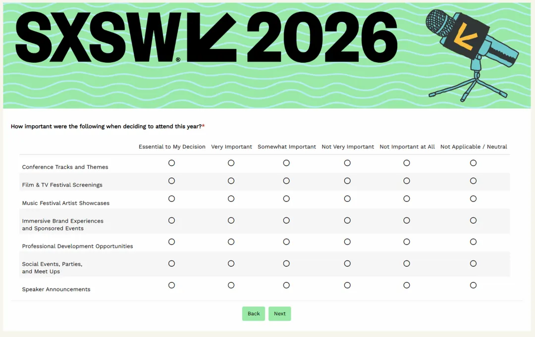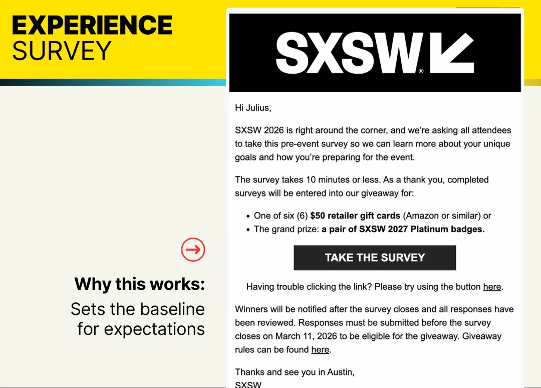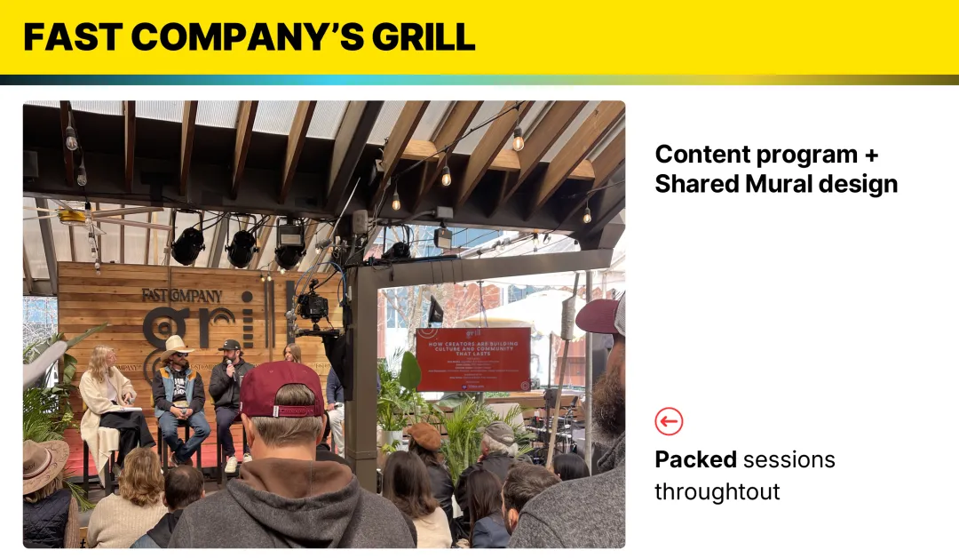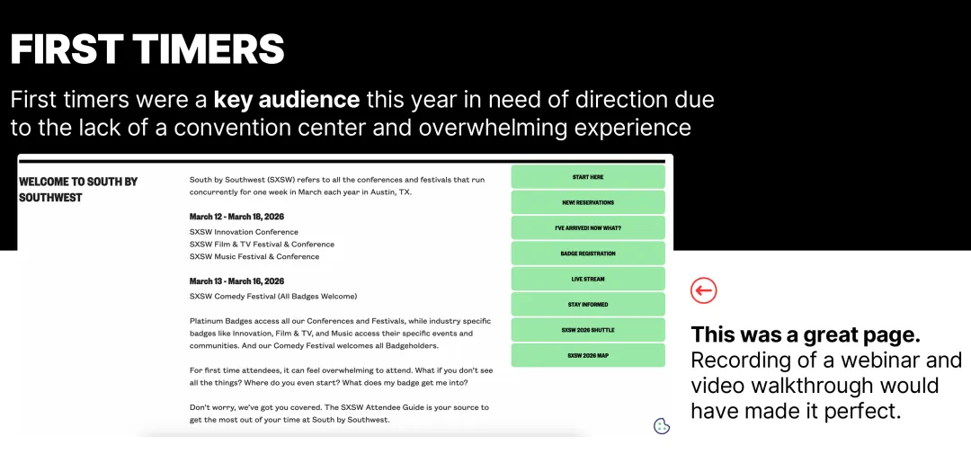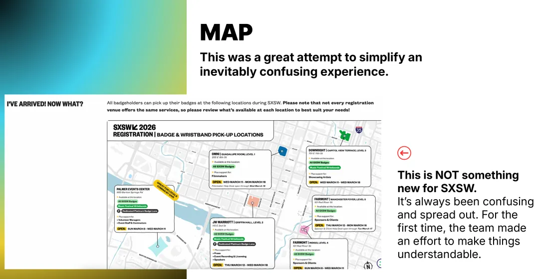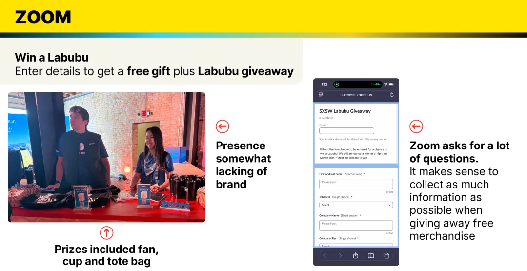 我是 Julius Solaris,这是你能读到的关于年度最重要活动最诚实的解读。欢迎来到 2026年西南偏南大会SXSW 。✅ 今年没有会展中心,反而激发了创新 —— 但也让第一次来的人彻底 懵 圈✅ 微型激活( Microactivations )大获全胜 —— 短注意力时代,这才是正解✅ Clubhouse 模式创造了身份认同与场景感SXSW 在活动开始前就做了一件聪明的事 —— 发了一份预活动体验调研问卷。 为什么这很重要? 因为它帮助主办方在活动开始前就校准了参与者的期望值,建立了基线数据。问卷设计合理,激励机制也到位 —— 完成填写就有机会赢得 $50 礼品卡,大奖是一对 2027 年的白金徽章。 值得学习。今年特别值得关注的一个群体是"首次参会者"。没有会展中心,整个城市就是会场,这对新人来说简直是噩梦级别的挑战。SXSW 为此制作了专属的新人引导页面,解释了不同徽章的权限,列出了活动时间表,给出了入场和领取徽章的完整指引。我要给这份新人 引导页打高分 。 如果再配上一个视频 Walkthrough,就完美了。历史上,SXSW 的地图一直是一场"认路噩梦"——分散、复杂、 令人抓 狂。今年,团队明显花了精力去改善这个问题。"我已经到了,然后呢?" —— 这个问题他们终于认真对待了。这不是什么新鲜事,SXSW 的地图一直都让人困惑。但今年是第一次,他们真的努力让事情变得清晰一点。 方向对了。未来四年,SXSW 都不会有会展中心(在翻修改造)。这听起来像是一场灾难。实际上,它是今年最大的惊喜。没有会展中心,意味着什么?意味着团队被迫重新定义"活动"本身。这种压力,让他们把奥斯汀这座城市变成了舞台。结果就是: SXSW 2026 更像一个来自未来的活动,而不是过去的那个版本。当然,代价也是真实的 —— 部分参会者,尤其是第一次来的人,真的在城市里迷失了。没有中心,没有锚点,很容易不知道该往哪走。从"一对多"的传统展会模式 → 走向"去中心化的微型活动生态"2025 年的模型:一个主活动 + 围绕它的一圈参展商。 单向输出,静态展示。2026 年的模型:一个主活动框架下,无数个微型活动节点同时运转,彼此连接,互相激活。 这才是未来。Clubhouse —— 三个主题聚合区,是今年 SXSW 最重要的结构性创新。这三个区域,分布在奥斯汀城市的不同地点,成为了徽章持有者的"参考坐标"。每个区域内,都有:Clubhouse 的意义远不止于"提供一个空间"。它创造了身份认同,让人知道自己属于哪个圈子,让赞助商有了精准的受众对接场景。 有主题,有归属,有上下文 —— 这才叫设计。国会大道的一段被封路了。对,就这么简单粗暴,也这么令人兴奋。这片区域专门用于品牌体验和内容活动。 把街道变成会场,这是活动设计最前沿的玩法之一。Boldpush 也是今年合作伙伴项目的参与方之一。合作伙伴内容项目非常成功,库存全部售罄。 一个字:供不应求。这一条我要单独提出来表扬 —— SXSW 团队今年在各个场馆为 ADA(残障人士)专门保留了优先座位。这是专业活动团队该有的基本责任感。 做得好。Rivian 今年在 Block Party 区域的赞助规模是压倒性的。你可以亲手驾驶 Rivian 的新车型,同时还有现场音乐助阵。 体验 + 产品 + 娱乐,三合一,干得漂亮。PwC 的玩法是这样的:先答题,答对了才能玩抓娃娃机。奖品包括袜子、礼品卡和收藏品。排队的人很多。概念很好,但有一个明显的 遗漏 :没有收集邮件。给了这么好的一个数据采集机会,结果就这么放掉了。Zoom 的激活围绕着一件事:赢得一只 Labubu 。参与方式是填写信息表单,换取免费小礼品,同时参与 Labubu 抽奖。奖品还包括风扇、水杯和 Tote Bag。合理的数据收集逻辑 —— 你要给出礼品,当然要尽量多收信息。 表单问题有点多,但从品牌获取用户数据的角度来说,完全说得通。唯一的问题是,现场的 Zoom 品牌 感有点弱 ,存在感不够突出。Cloudflare 找了一位艺术家专门创作了"音乐吊床"。非常受欢迎,人气很旺。这和 Cloudflare 的品牌到底有什么关系?这是个让人挠头的问题。人气高,品牌关联度低。做激活,有人气是第一步, 但别忘了讲品牌故事。Adweek 与埃森哲联合呈现,场地设在埃森哲的办公室内。今年 Adweek 做了一个 纯内容型 的选择 —— 不搞花哨的体验激活,专注于内容输出。而且在空间设计上非常用心: 圆形舞台,演讲者和观众围坐一圈,像在进行一场平等的讨论,而不是单向的演讲。这种设计极其适合录制传播内容。活动结束后,这些内容被整理发布到网站上,从线下到线上,内容生命周期被完整延伸。嘉宾阵容也非常硬核:Zoom、Adobe、3M……你想得到的顶级公司都来了。好内容 + 好设计 + 好传播 = 一流媒体品牌的正确打法。Fast Company 的活动全程座无虚席。内容节目本身就已经很精彩,但今年他们还做了一件特别的事:与德克萨斯 A&M 大学合作,联合艺术家 Jacob Maldonado,现场创作了一幅集体壁画。 每位参与激活的参会者都可以走进来,在这幅壁画上添上自己的一笔颜色。最终,这幅壁画将被捐赠给德克萨斯 A&M 大学,永久陈列于校园内。这件事的意义是什么?它把商业与文化、内容与社区、品牌与遗产巧妙地连接在一起。 Fast Company,做得非常漂亮。Inc. 的 Founders House 是我在整个活动中看到的最好的媒体内容与商业激活结合案例之一。让我给你拆解一下:- Capital One 激活区: 进场即获赠礼品,同时提供商务舱升级体验。这是机场贵宾室的场景植入,非常聪明 