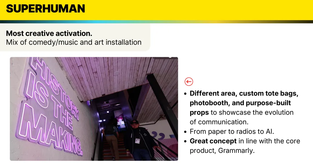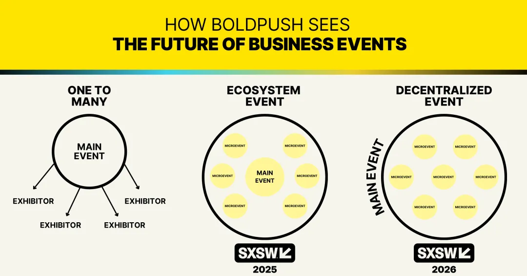 微型激活并联的模式在这里被完美印证:每隔几步就有新鲜感,注意力被持续拉住,每个人都能找到自己感兴趣的点。 这就是如何用活动把一个国家的文化带到世界面前。同一个场地,去年也是它,今年也是它。但内容和主题完全不同。去年,Julius 穿着皇帝服装出现在这里。今年,是牛仔 + Landman 的主题。 Paramount+ 的聪明之处在于:它建立了一套可复用的活动模板,每年只需更换内容主题,框架本身不变。这种"恒定结构 + 可变内容"的模式,极大地降低了每年重新创造的成本,同时又保持了新鲜感。拍照打卡点几乎无处不在 —— Survivor 50 的主题背景,还有精心布置的场景道具。 真正让一个普通 拍照区变得 值得分享的,是那些让你停下来、真正想进去的舞台布景。Tote Bag 的赞助设计也值得一提:每个人拎着印有 Paramount+ Logo 的包包走遍整个奥斯汀,就是一块移动的广告牌。Superhuman 是 Grammarly 背后的母公司,他们的激活围绕着一个主题展开: 人类沟通方式的演变史 。从纸张,到收音机,再到 AI —— 这条时间线被做成了一个互动艺术展览。核心概念与 Grammarly 的产品定位完美契合 —— 帮助人们更好地表达和沟通。唯一的小问题 :最终生成的照片上,Superhuman 的 Logo 太大、太明显,反而降低了人们自发传播的意愿。品牌标识与有机传播之间,需要找到那个微妙的平衡点。为了《使女的故事》续集《证明》的发布,Hulu 开了一辆紫色主题大巴开进了整个活动区域,车上的演员们穿着戏服,一边发放美味的浆果 挞 ,一边用剧中标志性的台词和鞠躬方式与观众互动。快速部署、强烈视觉冲击、天然的好奇心吸引 —— 这种游击式激活的成本不高,但制造的轰动效果是巨大的。这是一个关于"如何用创意代替预算"的好案例。一个运营了数十年的顶级活动,失去了 最 核心的物理载体——会展中心。任何人面对这个情况,都可以选择保守、选择等待、选择"先看看再说"。没有会展中心,所以整座城市成为了会场。没有中央焦点,所以创造了三个主题 Clubhouse 来提供方向感。没有固定路径,所以让品牌和内容散布在每一条街角,让参会者自己去发现。但这也是我见过的最接近"未来活动形态"的一次实践。去中心化、微型激活、沉浸式体验、内容驱动、品牌故事化 —— 这五个词,就是 2026 年的活动关键词,也是未来几年你需要认真面对的议题。本报告由 Boldpush 出品 —— 面向活动策略师的内容与社群平台。 如果你想在这个行业更进一步,有两条路:加入 Boldpush + 社群,或者与我们合作进行活动营销咨询。会展数字化聚焦会展行业的数字化转型,提供数字会展洞察、国际行业趋势、最佳实践案例和知识的分享与交流。在这里,您还可以免费领取《2021-2025中国会展主办机构数字化调研报告(DRCEO)》、《数字会展术语白皮书(2025)》、《线上线下融合会展白皮书》,了解中国会展业数字化创新大会(CEIDIC)的最新信息,详情添加客服微信:19117363991,备注“领取会展数字化报告”或“CEIDIC大会”,同时,欢迎针对会展数字化主题进行投稿。