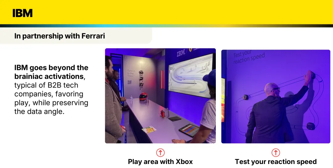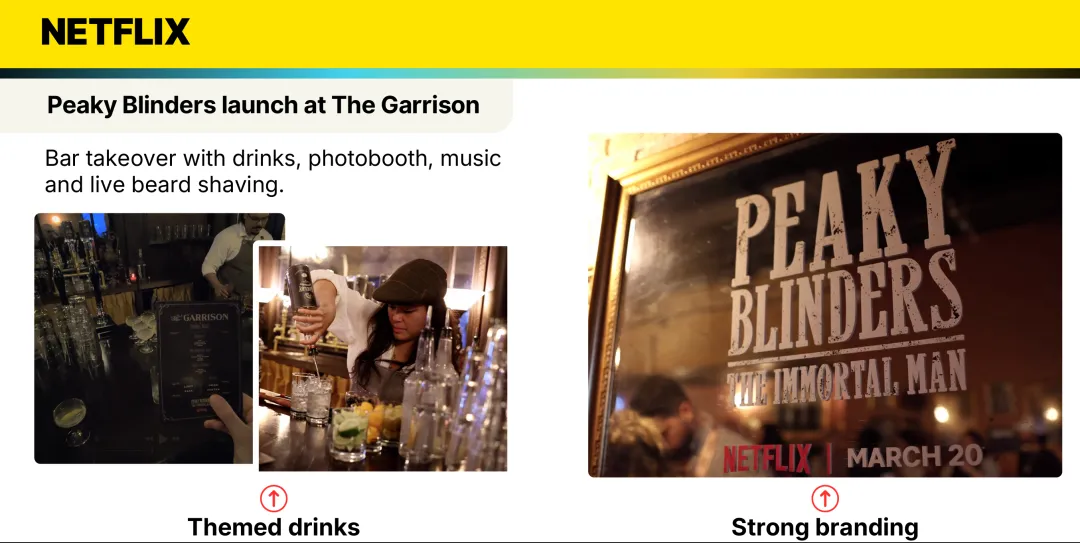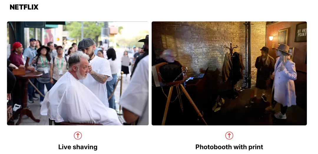 整个 Founders House 的关键逻辑是: 邀请合作伙伴共享激活空间,分摊成本,放大效果,同时又保持了整体品牌的统一性。 聪明的模板,值得借鉴。IBM 联手法拉利。你以为这会是一个充满数据图表、严肃枯燥的 B2B 展台? 完全不是。IBM 彻底抛弃了那种典型科技公司的"聪明人说教"风格, 转而让 人们 玩起来 :品牌信息呢? 依然在场 —— IBM 用数据赋能法拉利,在 最 关键的时刻做出最快的决策。这个 故事被讲出来 了,但方式是让你去玩、去感受,而不是去听课。这才叫活学活用:保持数据叙事内核,但用游戏化的方式传递它。强烈建议所有 B2B 品牌来学习。Netflix 为 Peaky Blinders 新剧的发布打造了完整的沉浸式体验:- 整个酒吧被接管 ,化身为剧中的 Garrison 酒馆